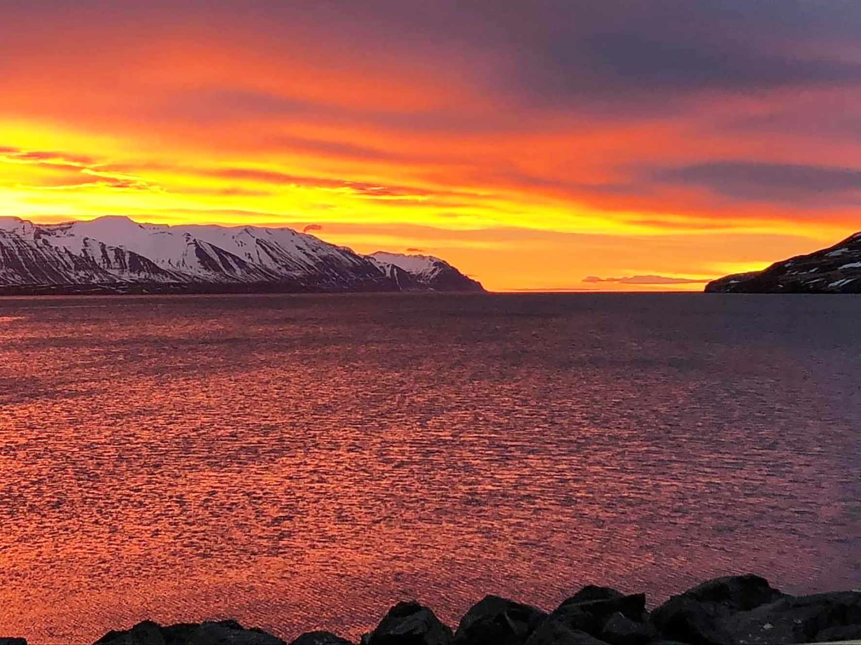Útsýni frá hótelinu út Eyjafjörð er sérlega tilkomumikið og ekki ónýtt að fylgjast með sólarlaginu á fallegu sumarkvöldi þaðan.