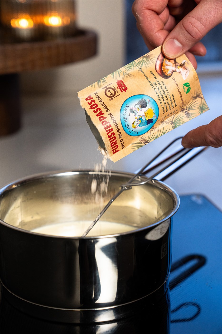 Sæbjörg segist hafa mjög gaman af því að tína villisveppi og hefur Eyvindur í gegnum tíðina notað sveppina til matreiðslu, en hann er menntaður kokkur. Þar sem þau áttu byggingarnar á Flateyri áfram ákváðu þau að sækja um styrk hjá Högum til að gefa Eyvindi færi á að þróa sósurnar áfram, enda magnið af sveppunum orðið mikið. Þau hlutu þann styrk og er afurðin af því pakkasósur framleiddar úr íslenskum villisveppum. „Sósurnar fást í Hagkaup og fara að potast í aðrar búðir í mars,“ segir Sæbjörg.