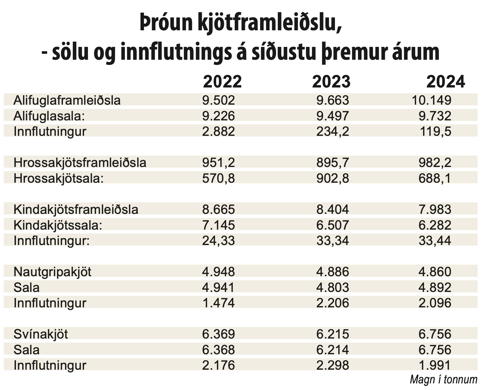 Mikill samdráttur var í innflutningi á alifuglakjöti, eða 49 prósent, og voru flutt inn 119 tonn í fyrra samanborið við 234 tonn árið 2023. Um 1.991 tonn var flutt inn af svínakjöti á síðasta ári, sem er um 14 prósent minna magn en árið á undan, og 2.096 tonn af nautgripakjöti, sem er fimm prósent minna magn en á árinu 2023.