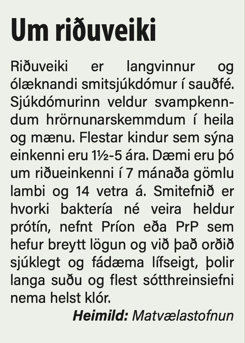 Síðan er þetta beina smit frá dýri til dýrs, sem þýðir að það á ekki að vera að flytja kindur á milli bæja eða taka aðkomufé inn í fjárhús til sín – sem mér finnst alveg skelfilegt. Þótt það sé ekki bannað þá er það bara of mikil áhætta því riðan smitast gjarnan einmitt í gegnum drykkjaráhöld eða við fóðurgrindur.