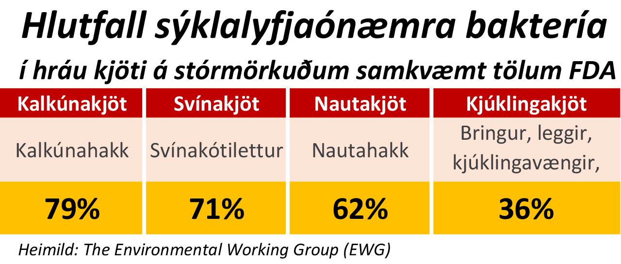 Í úttekt The Environmental Working Group (EWG) sem kom út á síðasta ári kemur fram að opinberar rannsóknir á tíðni baktería í stórmörkuðum sýni að tíðni sýklalyfjaónæmra baktería í kjöti sem þar er í boði er stöðugt að aukast.