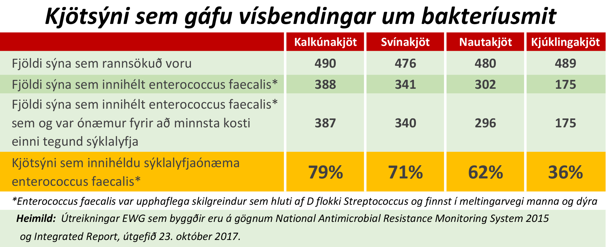 Skýrsluhöfundar EWG segja að yfirvöld taki sýni á hverju ári í matvöruverslunum til að kanna algengi baktería sem geti valdið fæðubornu smiti. Það eigi t.d. við kamfýlóbakteríu, salmonella og E.coli. Það eigi einnig við „enterococcus“ sem finnst gjarnan í meltingarvegi og vísindamenn nota m.a. til að rekja sýklalyfjaónæmar bakteríur.