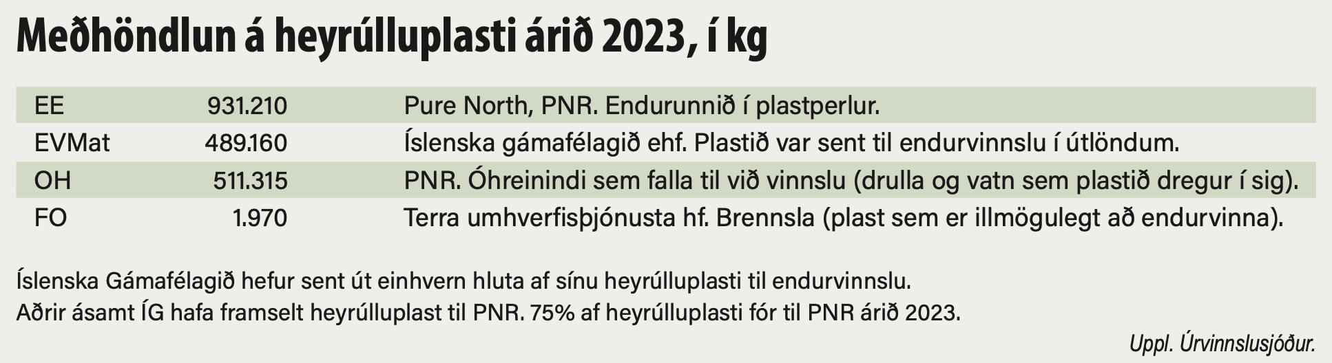 √ Talið er að um 95 prósent heyrúlluplasts komi til baka í endurvinnslu. Allt að 24 prósent þess eru send erlendis en 76 prósent fara til endurvinnslufyrirtækisins Pure North Recycling í Hveragerði sem er eina plastendurvinnslufyrirtæki Íslands sem fullvinnur hráefnið í plast til framleiðslu á nýjum plastvörum.