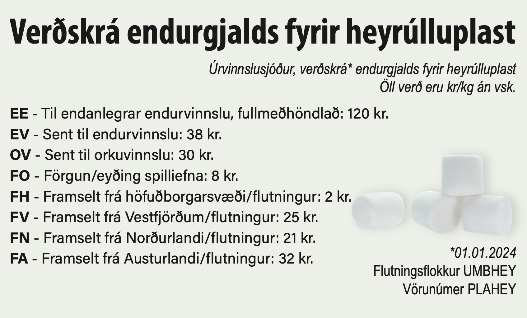 Jóhannes segir verðlag á heyrúlluplasti hafa hækkað um u.þ.b. 13-14 prósent sé horft aftur til ársins 2019. „Það hefur á hinn bóginn lækkað um nálega 17 prósent frá vetrinum 2022–2023, þegar plastverð náði hvað hæstum hæðum,“ segir hann enn fremur.