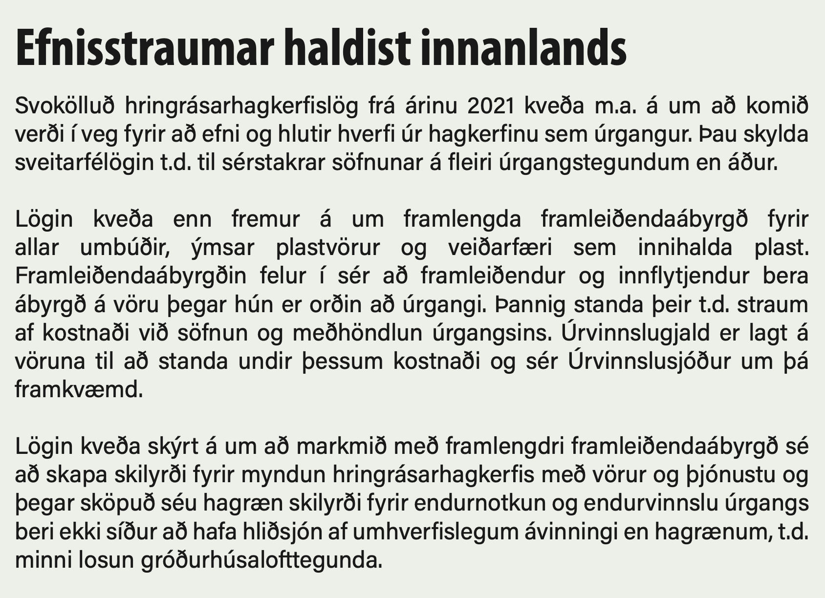 Jafnframt skipti stefna stjórnvalda máli og að farið sé eftir henni. „Framleiðsluiðnaður á Íslandi þarf að komast á þann stað að hann sé að nýta og kaupa inn aðföng og hráefni úr endurunnum efnum. Í lok dags eru það krónurnar sem skipta máli og ef þú hefur valkost um kolefnisspor eða krónur þá munu langflestir fara eftir krónunum, þannig er það bara,“ bætir hann við. Þetta verði að ganga upp viðskiptalega séð. Meðan munurinn sé ekki meiri en raun ber vitni verði erfitt að breyta, og breyta nægilega hratt.