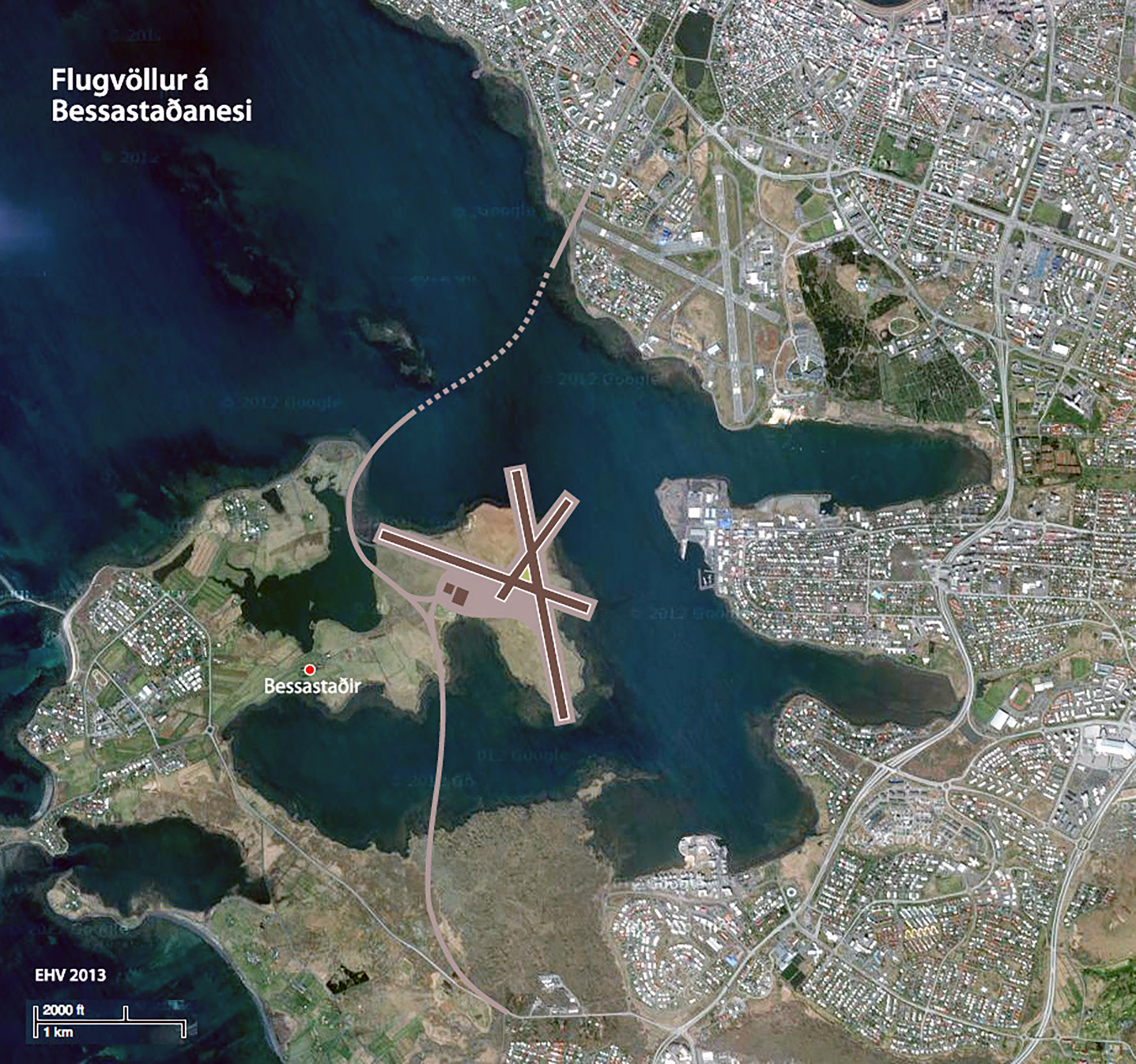 Í hugmynd Emils Hannesar Valgeirssonar er Reykjavíkurflugvöllur einfaldlega fluttur yfir á Bessastaðanesið í nær óbreyttri mynd og virðist rúmast þar ágætlega.
