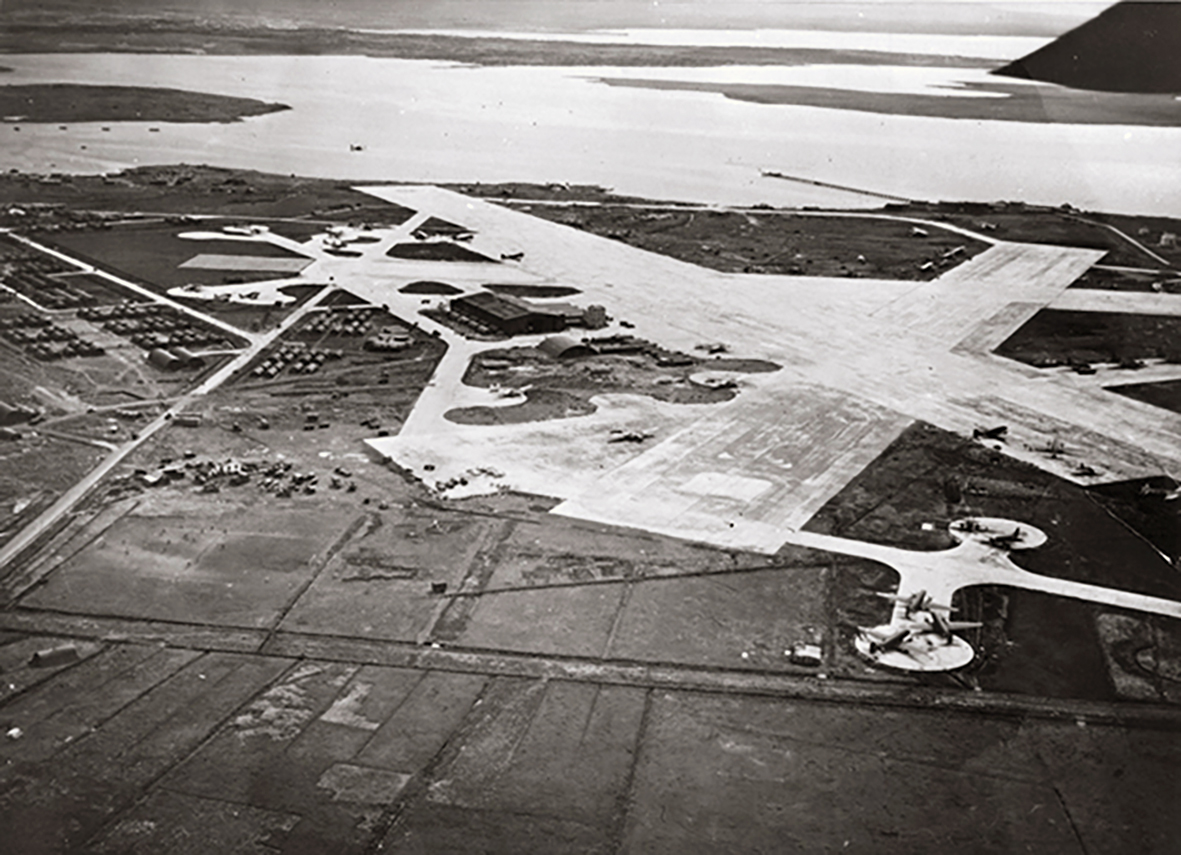 Flugflotastöð í Reykjavík 15. október 1943. Þá var flugvöllurinn sem breski flugherinn (RAF) byggði í Vatnsmýrinni á árunum 1940 til 1941 kominn undir stjórn Bandaríkjamanna og hafði bæði bandaríski flotinn og flugherinn þar aðstöðu. Ef vel er að gáð má sjá C-47 flutningavélar á stæði neðst í hægra horninu. Mynd / U.S. Navy Seabee Museum
