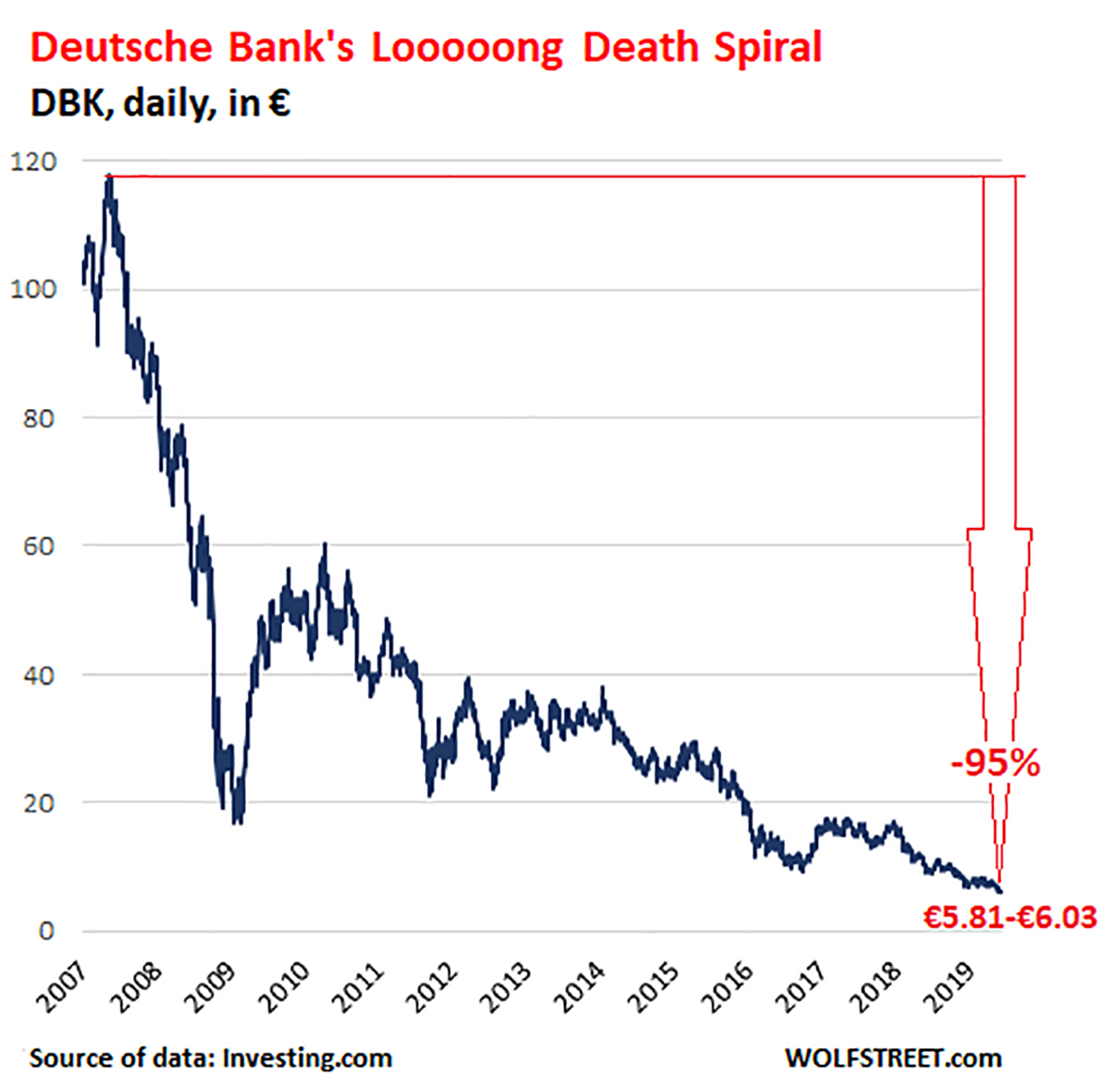 Hér fyrir ofan er graf Wolf Richter af verðþróun hlutabréfa í Deutsche bank. Það sýnir 95% fall frá 2007 sem hann kallar „dauðaspíral” bankans.