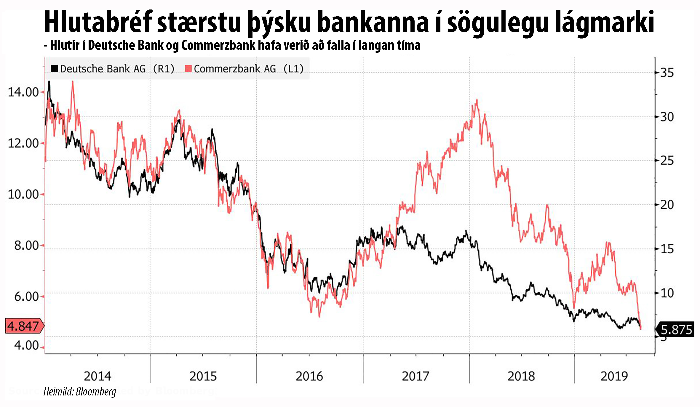 Það nýjasta í málefnum Deutsche Bank er að eftir stærstu endurskipulagningu sem hafin var í júlí virðist gæfan hafa snúist gegn forstjóranum Christian Sewing. Eða í öllu falli hefur þýski markaðurinn gert það að mati Bloomberg. Í grein í þeim miðli föstudaginn 16. ágúst var greint frá því að hlutabréf í bankanum hafi þá fallið í sögulega lægð sem þýði að Þýskaland dansar á mörkum nýrrar bankakreppu. Endurskipulagningin þar sem áherslan var dregin frá fyrirtækjum á Wall Street að útflutningsfyrirtækjum í Þýskalandi hafi komið á mjög vondum tímapunkti. Vegna viðskiptastríðs Bandaríkjanna við Kína séu stóru þýsku iðnframleiðendurnir, Daimler AG, BASF SE, Continetal AG og Henkel AG, að draga saman seglin. Enn frekari samdráttur gefi ekki svigrúm fyrir nein mistök.