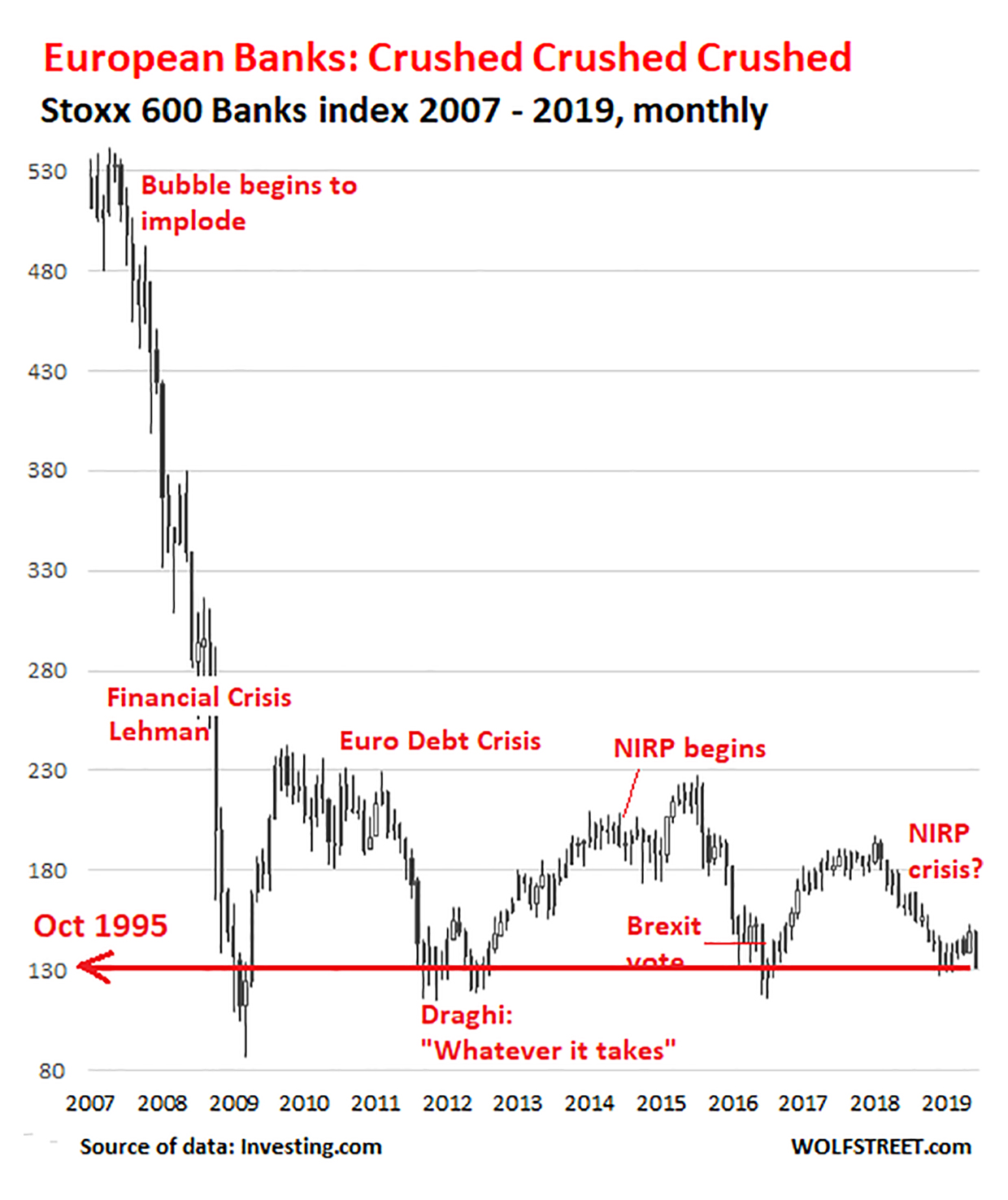 Wolf bendir á að evrópskir bankar hafi ekki náð að rétta sig af um síðustu áramót, heldur haldið áfram að falla á verðbréfamörkuðum. Frá febrúar 2018 til 27. desember 2018 féll bankahlutabréfavísitala Stoxx 600 um 33%. Í júní 2019 var staðan litlu betri en hún var í lok desember.