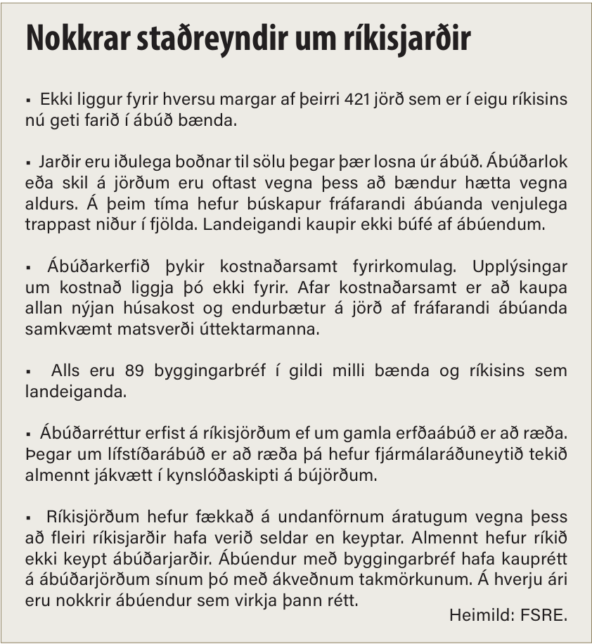 Ríkissjóður er stærsti einstaki landeigandi á Íslandi og á 421 jarðir víðs vegar um landið. Þrátt fyrir það hefur ekki farið fram heildstæð endurskoðun á jarðasafni ríkisins með tilliti til markmiða, nýtingar og almannahagsmuna. Nú liggur fyrir að jarðalögum á að breyta til að vinna gegn samþjöppun og stuðla að nýtingu ræktarlands til búrekstrar, en sú vinna er ekki hafin. Samhliða er unnið að greiningu á ríkisjörðum, þar sem jarðir verða flokkaðar eftir því hvort ríkið eigi að halda þeim, selja eða nýta með öðrum hætti. Niðurstöður þessarar stefnumótunar munu hafa bein áhrif á bændur, búsetu í sveitum og framtíð ræktarlands. Hér er rýnt í eignastefnu ríkisins og aðrar heimildir um ríkisjarðir.