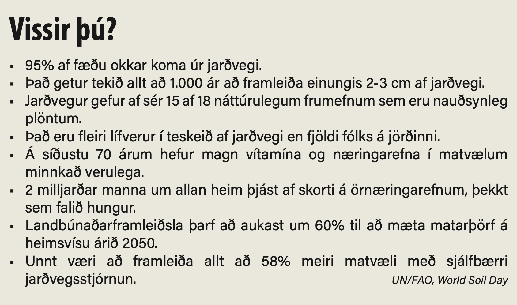 Aðspurð um jarðvegstap segja Bryndís og Jóhann að á seinustu 150 árum sé talið að á heimsvísu hafi um helmingur af frjósamasta hluta jarðvegs tapast.