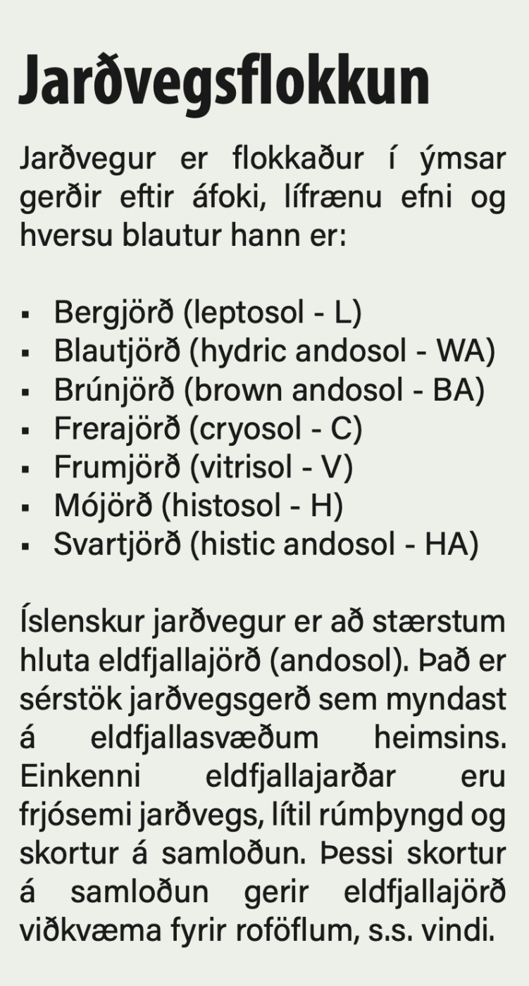 Jarðvegur er mjög fjölbreyttur að gerð og eðliseiginleikum. „Hér á Íslandi er jarðvegurinn á margan hátt sérstakur þegar litið er til annarra svæða á Jörðinni. Vegna mikillar eldvirkni er jarðvegurinn mótaður af eiginleikum gjóskuefna og telst til eldfjallajarðvegs. Slíkur jarðvegur hefur gjarnan lága eðlisþyngd, mikla vatnsheldni og litla samloðun. Hann getur líka innihaldið mjög mikið kolefni í samanburði við aðrar jarðvegstegundir. Þetta, ásamt því hvað landið er ungt og jarðvegurinn því sömuleiðis, hefur það í för með sér að jarðvegurinn er auðrofinn, hvort sem er vindrof eða vatnsrof.