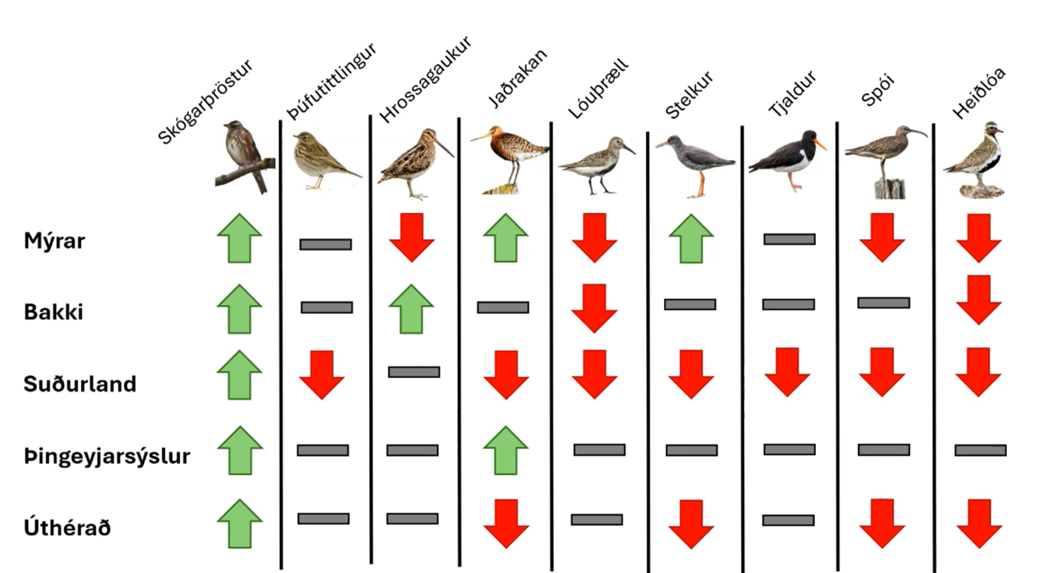 Í ljós hefur komið að skógarþröstum fjölgar á öllum svæðum, sem ekki kemur á óvart þar sem skógrækt er alltaf að aukast. Þúfutittlingur stendur í stað á flestum svæðum en fækkar þó á Suðurlandi. Hrossagauk fækkar á Mýrum, fjölgar á Bakka og stendur í stað á öðrum svæðum, og er það dæmi um stofn í jafnvægi. Jaðrakan fækkar á Suðurlandi og Úthéraði en fjölgar í Þingeyjarsýslum og Mýrum. Lóuþræl fækkar á Mýrum, Bakka og Suðurlandi en stendur í stað í Þingeyjarsýslum og á Úthéraði. Stelk fækkar á Suðurlandi og Úthéraði, fjölgar á Mýrum en stendur í stað annars staðar. Tjaldur stendur að mestu í stað þótt honum fækki á Suðurlandi.