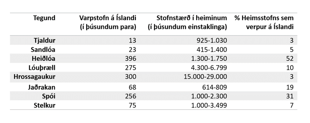 Á Íslandi eru mjög stórir heimsstofnar þessara tegunda. Talið er að 5% af öllum tjöldum og hrossagaukum heimsins verpi á Íslandi, milli 10 og 20% af öllum jaðrakönum, lóuþrælum og stelkum, og milli 30 og 60% af spóum og heiðlóum heimsins verpur hér á landi.