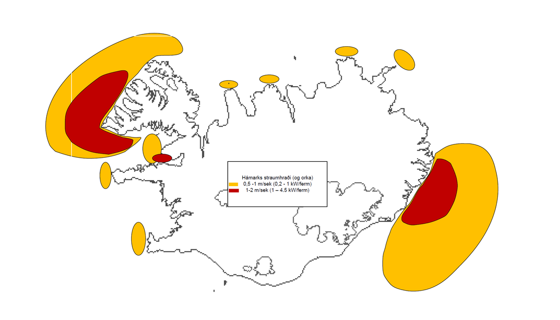 Heimildir: Sjávarfallaorka 2025, Staða tækniþróunar og nýtingar, Valorka. Skýrsla starfshóps umhverfis-, orku- og loftslagsráðherra um bætta orkunýtni og ný tækifæri til orkuöflunar, 2024. Orka sjávar óbeisluð, fréttaskýring, Bændablaðið, okt. 2023.
