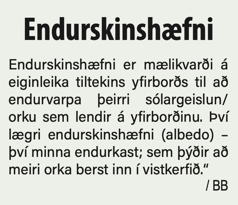 „Þegar sól skín á yfirborð jarðar gerist tvennt: Hluti geislunarinnar endurkastast út í geiminn en jörðin gleypir hluta sólarorkunnar og hún breytist í varma,“ segja þau Þóra Ellen og Ólafur og halda áfram: „Þessi varmi dreifist á endanum um lofthjúpinn og veldur loftslagshlýnun. Það fer eftir því hversu dökkt yfirborðið er hvað það dregur mikinn hluta sólargeisla í sig og hversu stórum hluta er endurvarpað.
