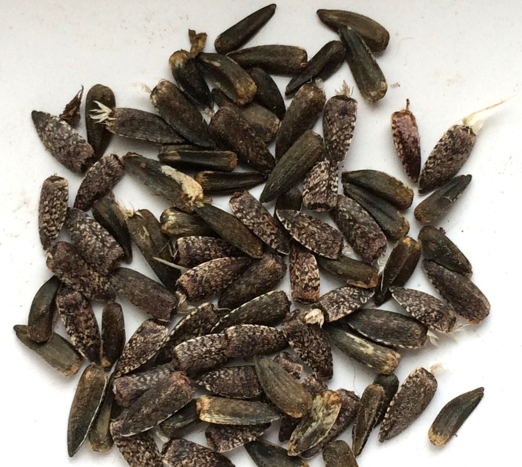 Fræin flöt og 5 til 7 millimetra löng, brún með svörtum rákum og smáhærð.