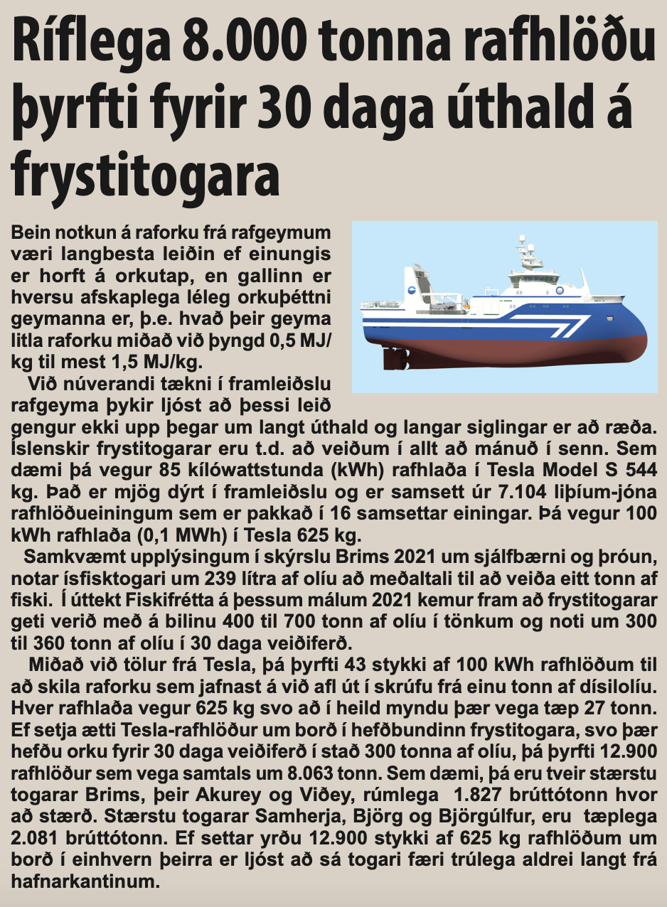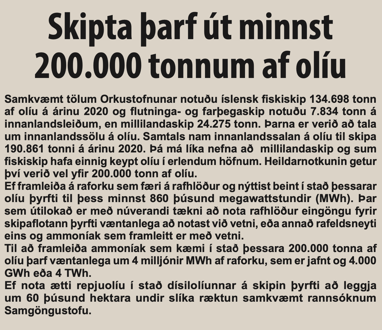 Til að framleiða ammoníak sem dygði á allan íslenska skipaflotann þyrfti virkjun með nærri því jafn mikið afl og fæst út úr Kárahnjúkavirkjun. Það myndi síðan draga úr losun skipaflotans sem nemur um 750.000 tonnum af CO2 á ári.