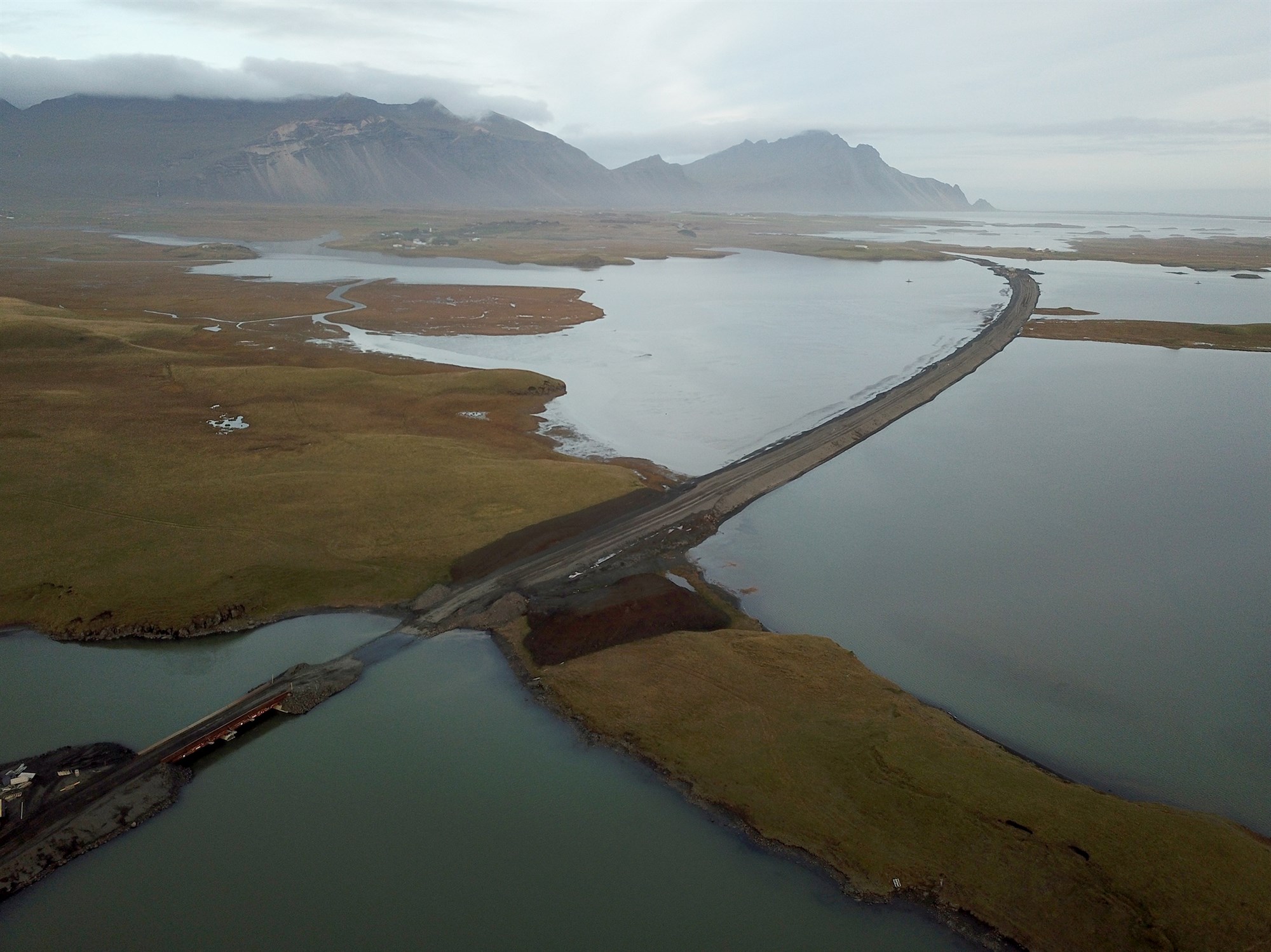 Veglagningin yfir voginn á milli Hríseyjar og Árnaness, þar sem sameiginlegt útfall Hoffellsár og Laxár rennur til sjávar.
