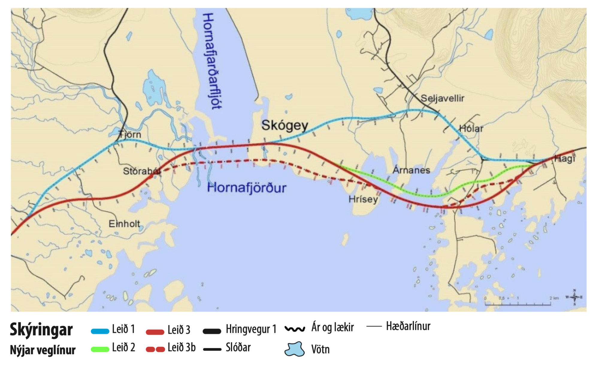[...] Það er því niðurstaða bæjarstjórnar Hornafjarðar að leið 3 í tillögum Vegagerðarinnar sé besti kosturinn af þeim leiðum sem hún leggur til að verði metnar í framkvæmdamati. Ekki síst vegna bætts umferðaröryggis sem og verulegrar styttingar á vegalengdum innan sveitarfélagsins sem leið 3 hefur í för með sér. Niðurstaða bæjarstjórnar Hornafjarðar er því að leið 3 verði fyrir valinu með þeirri breytingu að ekki verði farið út í Skarðsfjörð með veginn,“ segir í bókuninni.