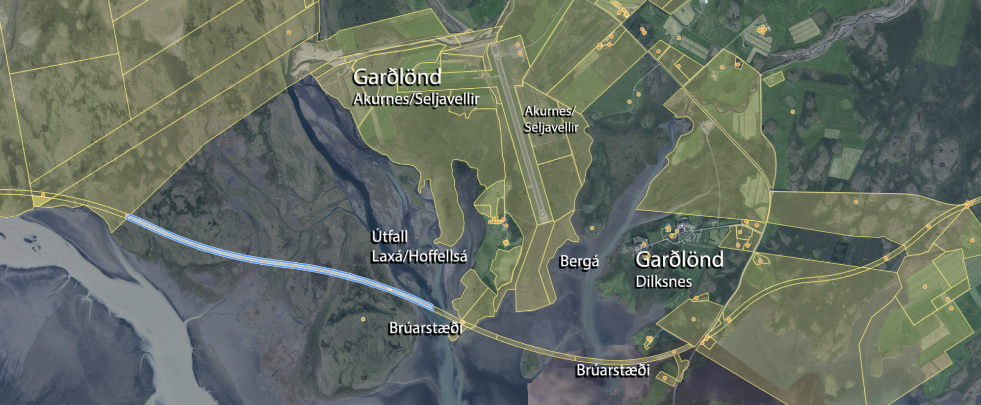 Hér má sjá legu ræktarlanda miðað við bæði brúarstæðin. Mynd / map.is