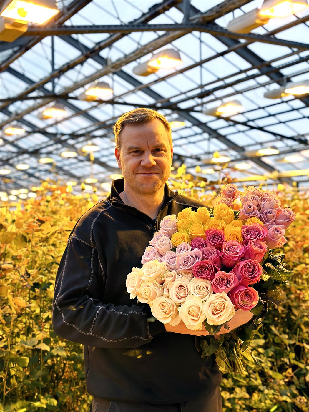 Axel Sæland með rósabúnt úr ræktun sinni.
