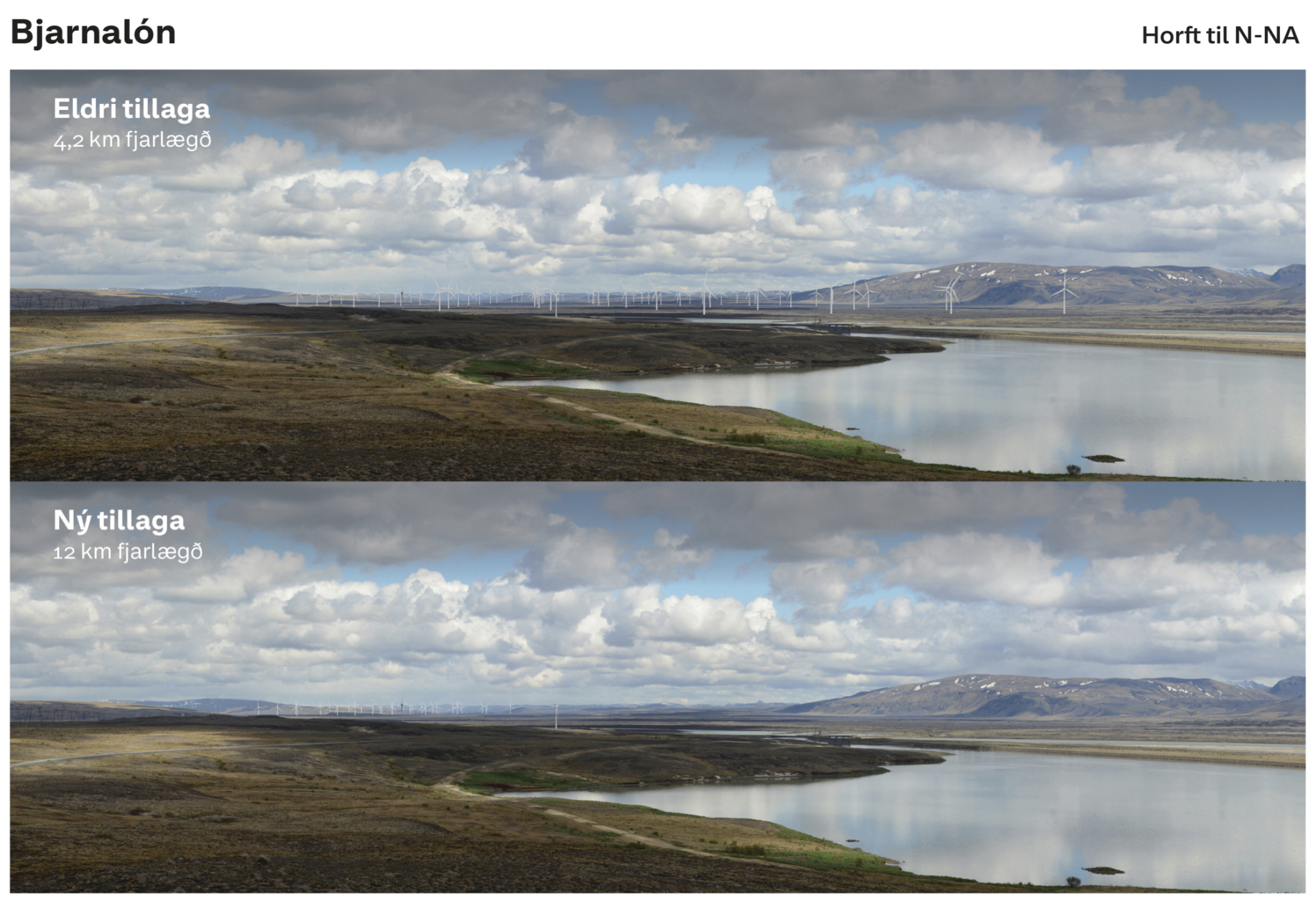 Á þessari skýringamynd frá Landsvirkjun sést samanburður á fyrstu tillögunni að Búrfellslundi og þeirri sem stefnt er á að reisa. Upphaflega var lagt upp með 67 vindmyllur, en þeim hefur verið