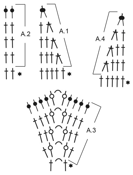 Haldið svona áfram með mynstur. Fækkið um 1 lykkju í hverri umferð í A.1 og A.4 og aukið út um 1 lykkju hvoru megin við loftlykkjuboga í A.3 (= 2 lykkjur fleiri í hverri umferð í A.3), þ.e.a.s. lykkjufjöldinn verður sá sami. Athugið heklfestuna.