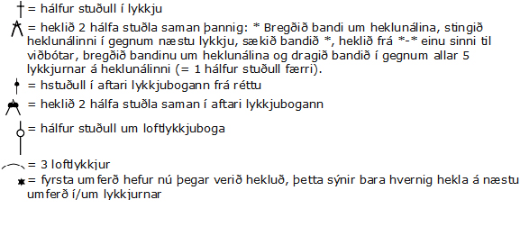 = heklið 2 hálfa stuðla saman þannig: * Bregðið bandi um heklunálina, stingið heklunálinni í gegnum næstu lykkju, sækið bandið *, heklið frá *-* einu sinni til viðbótar, bregðið bandinu um heklunálina og dragið bandið í gegnum allar 5 lykkjurnar á heklunálinni (= 1 hálfur stuðull færri).