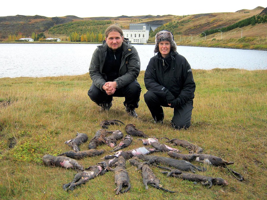 Önnur mynd kemur í hugann. Við mæltum okkur mót, Jakub Ckopuroski frá Póllandi, Rannveig Magnúsdóttir túlkur og ég (RB). Við hófum ferðina við Þrastalund og við vitjuðum um nokkrar minkasíur á svæðinu frá Þrastalundi upp að Þingvallavatni og vorum um hádegi búin að finna 17 minka. Því miður er varla unnt að nota minkasíur nema á Íslandi vegna annarra vatnadýra.