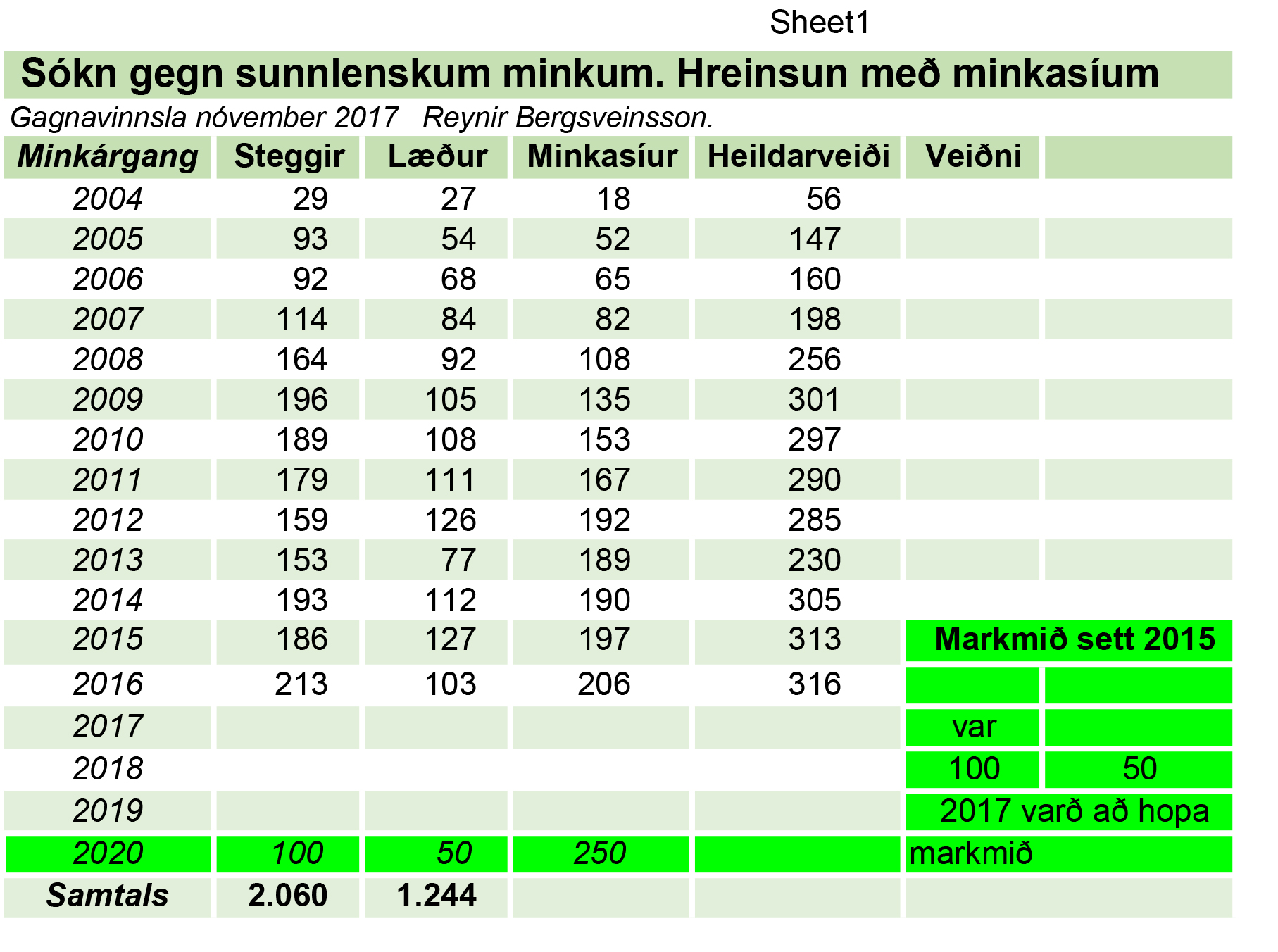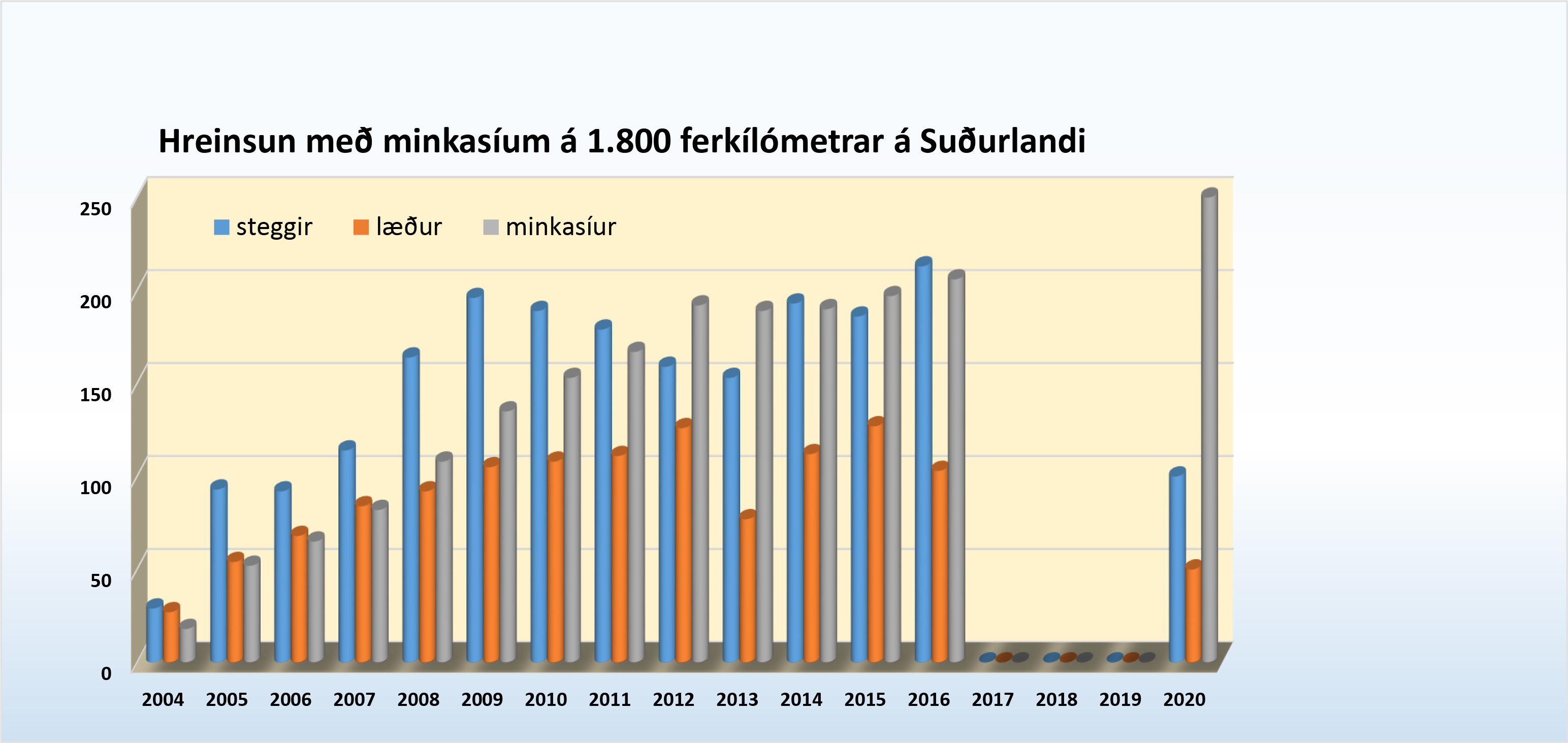 Nú að nýloknu uppgjöri minkaársins 2016 fyrir Suðurland, það er að segja fyrir 6 sveitarfélög á Suðurlandi, þá er litið til baka yfir12 ára aðgerðir og 3154 minka. Það má læra mikið um minkastofninn á Íslandi með samfelldri vinnslu og skráningu í mörg ár. Minkasíur eru yfirleitt alltaf á sama stað og halda því föstu og óbreyttu veiðiálagi á hverjum stað í mörg ár. Skráningin snýst ekki eingöngu um skýrslu til sveitarfélags, heldur hitt að árangur veiðanna, ástand stofnsins og margt er gerist á vettvangi tegundarinnar má lesa úr skráningu 5000–6000 einstaklinga á mörgum mismunandi svæðum í 13 ár.
