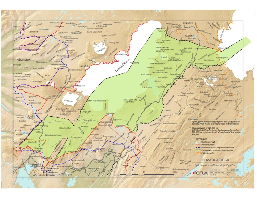 Eins og kemur fram á kortinu, sem var unnið af Verkfræðistofunni Eflu, mun garðurinn ná yfir 64,4% af sveitarfélaginu. Töluverð andstaða er á meðal sveitarstjórnar og íbúa í Bláskógabyggð um stofnun Miðhálendisþjóðgarðs, fólk vill allavega fá miklu meira samráð frá stjórnvöldum um málið.