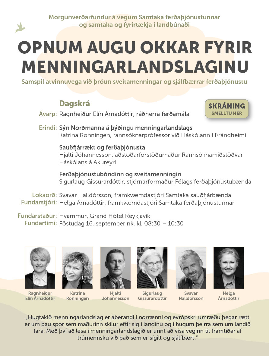 Samtök ferðaþjónustunnar ásamt samtökum og fyrirtækjum í landbúnaði standa fyrir morgunverðarfundi föstudaginn 16. sept. nk. þar sem gildi menningarlandslags verður í brennidepli. Þar verður fjallað um samspil atvinnuvega við þróun sveitamenningar og sjálfbærrar ferðaþjónustu. Meðal fyrirlesara er Katrina Rönningen prófessor við Háskólann í Þrándheimi en hún mun lýsa sýn Norðmanna á þýðingu menningarlandslags.