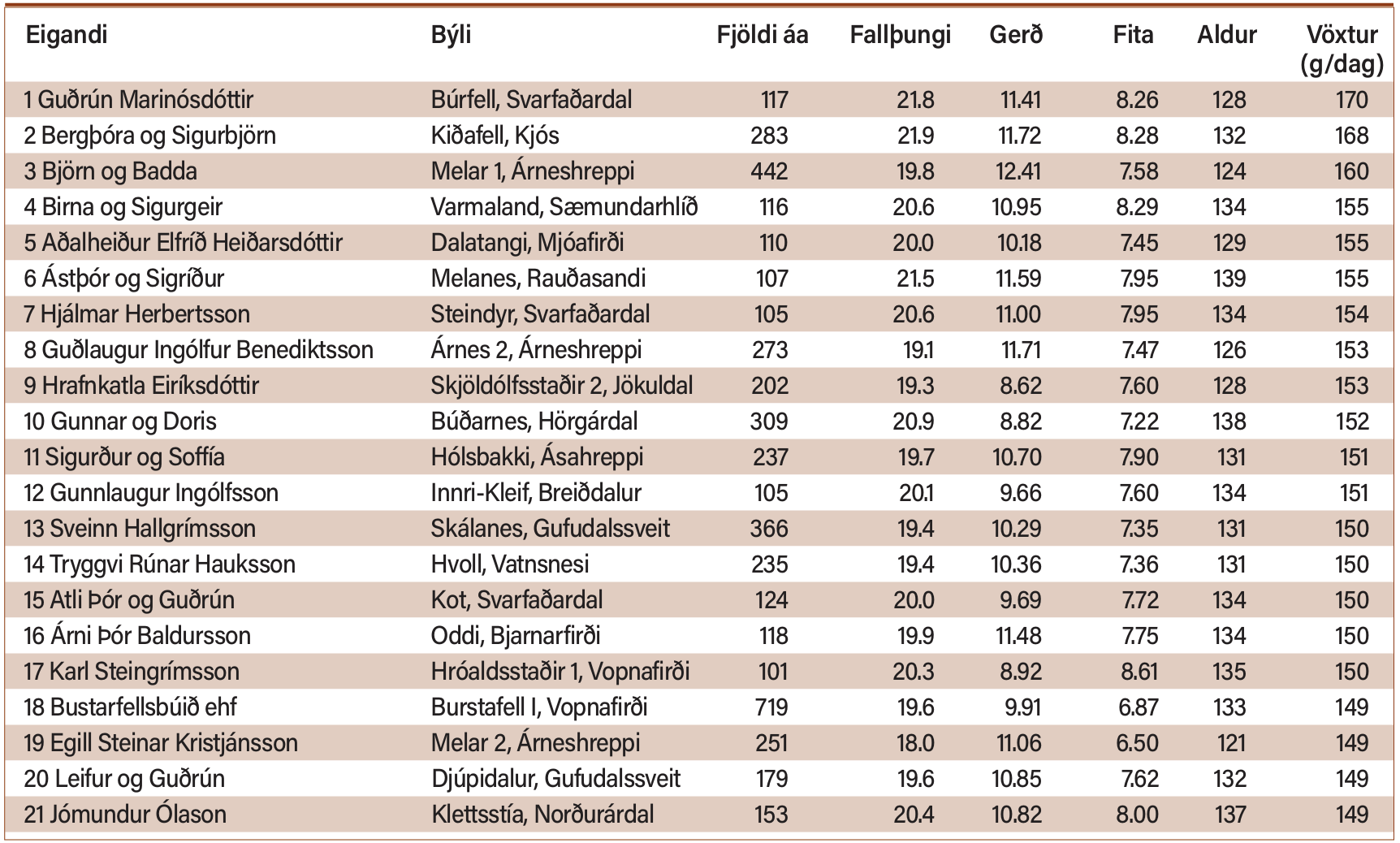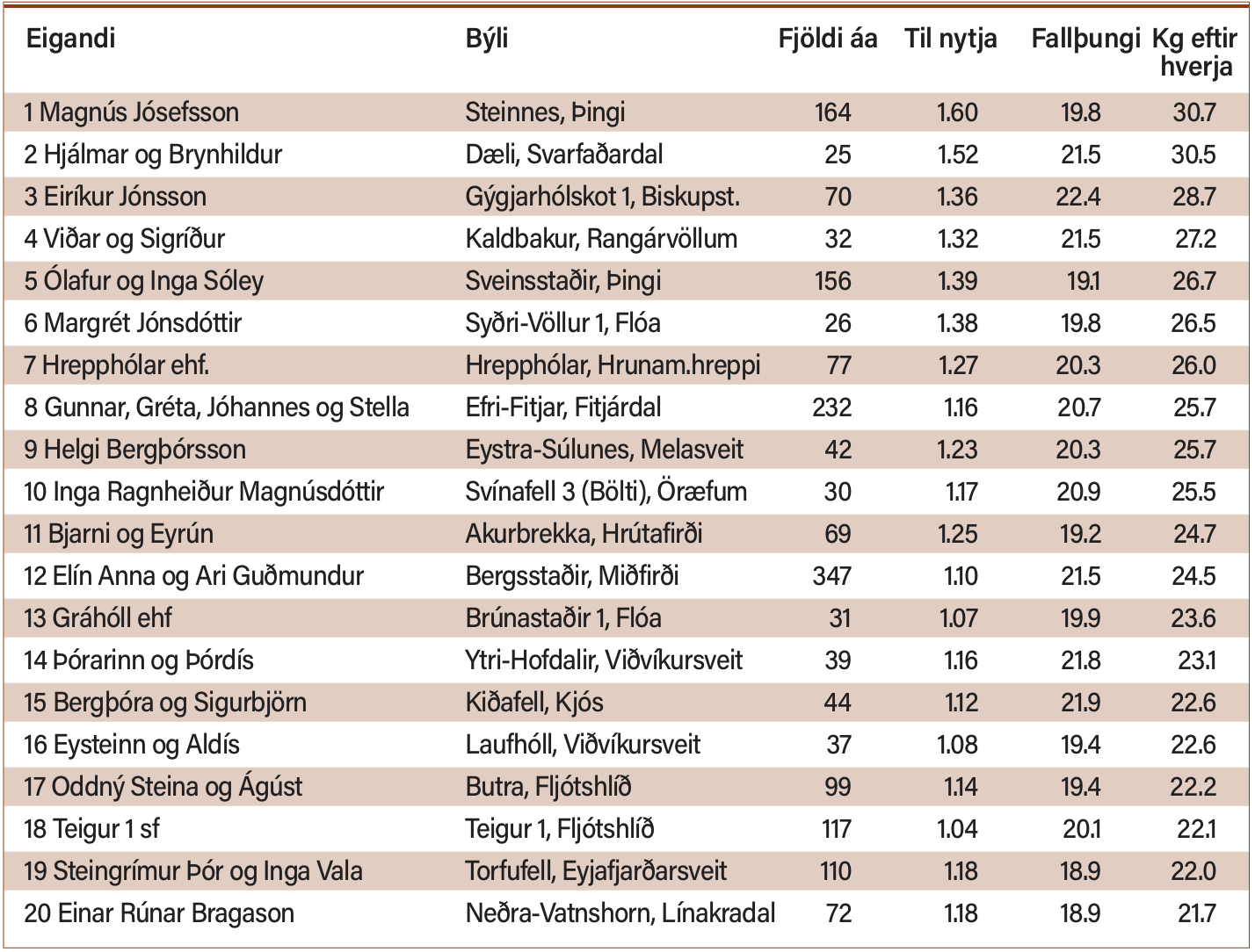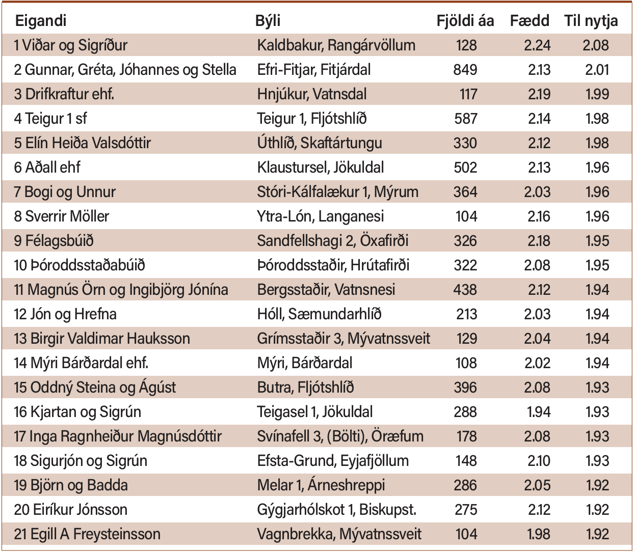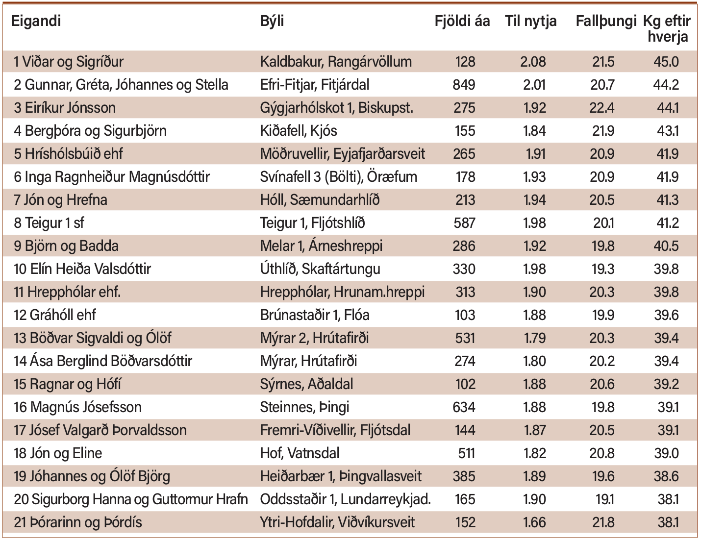Efstu búin á lista yfir kg kjöts eftir hverja á (tafla 1) sýna hvað hægt er að ná gríðarlegum afurðum þar sem saman fer að frjósemi er góð, mikil vaxtargeta fyrir hendi hjá lömbunum og aðstæður með þeim hætti að sú vaxtargeta er nýtt. Búum sem ná 40 kg eða meira eftir hverja fullorðna á fjölgar hægt en örugglega. Líkt og árið 2024 eru það níu bú sem ná því marki. Efst stendur Kaldbakur á Rangárvöllum með 45 kg eftir ána. Í öðru sæti eru Efri-Fitjar í Fitjárdal með 44,2 kg, í þriðja sæti er Gýgjarhólskot í Biskupstungum með 44,1 kg og í fjórða sæti er Kiðafell í Kjós með 43,1 kg.