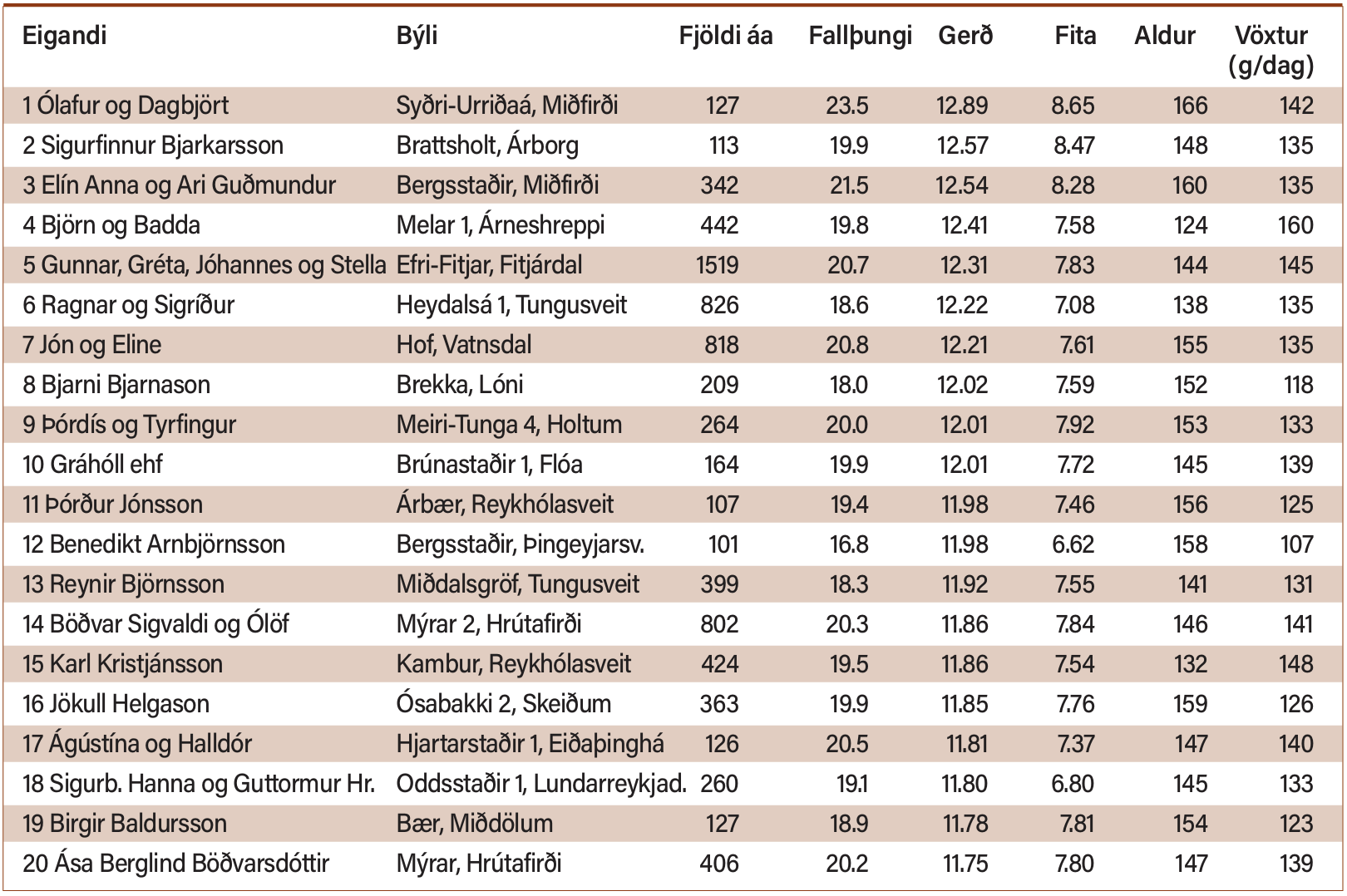 Efsta bú landsins er Syðri-Urriðaá í Miðfirði með gerðareinkunn upp á 12,89 við 23,5 kg fallþunga. Það er athyglisverður árangur þar sem verið er að byggja upp nýja hjörð eftir fjárskipti og lömbin því eingöngu undan ungum ám. Greinilegt er að vel hefur tekist til við val á gimbrum og meðferð lambanna framúrskarandi. Til upprifjunar, þá mældist bakvöðvi í hrútlambi á Syðri-Urriðaá 49 mm í haust, sem var þykkasta bakvöðvamæling landsins þetta árið. Það bú sem setið hefur á toppnum á þessum lista síðustu fjögur árin, Brattsholt í sveitarfélaginu Árborg hefur nú verið velt úr sessi og verður að láta sér annað sætið lynda með gerðareinkunnina 12,57. Listi yfir hæstu búin er birtur í töflu 4.