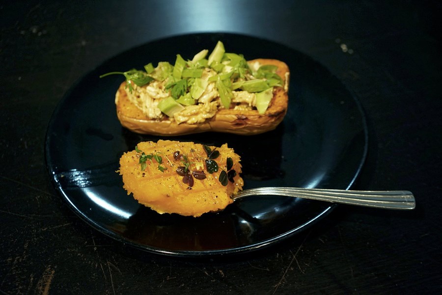 Framreiðið salatið á graskersbrauði eða í bökuðu graskeri og brauðið til hliðar með vel af köldu smjöri.