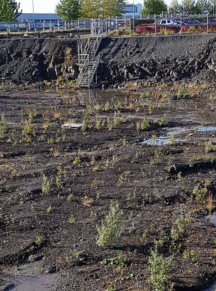 Þrátt fyrir að enn hafi ekkert orðið úr byggingu hússins hefur holan tekið talsverðum breytingum á þessum fimm árum því talsvert af gróðri hefur fest þar rætur.