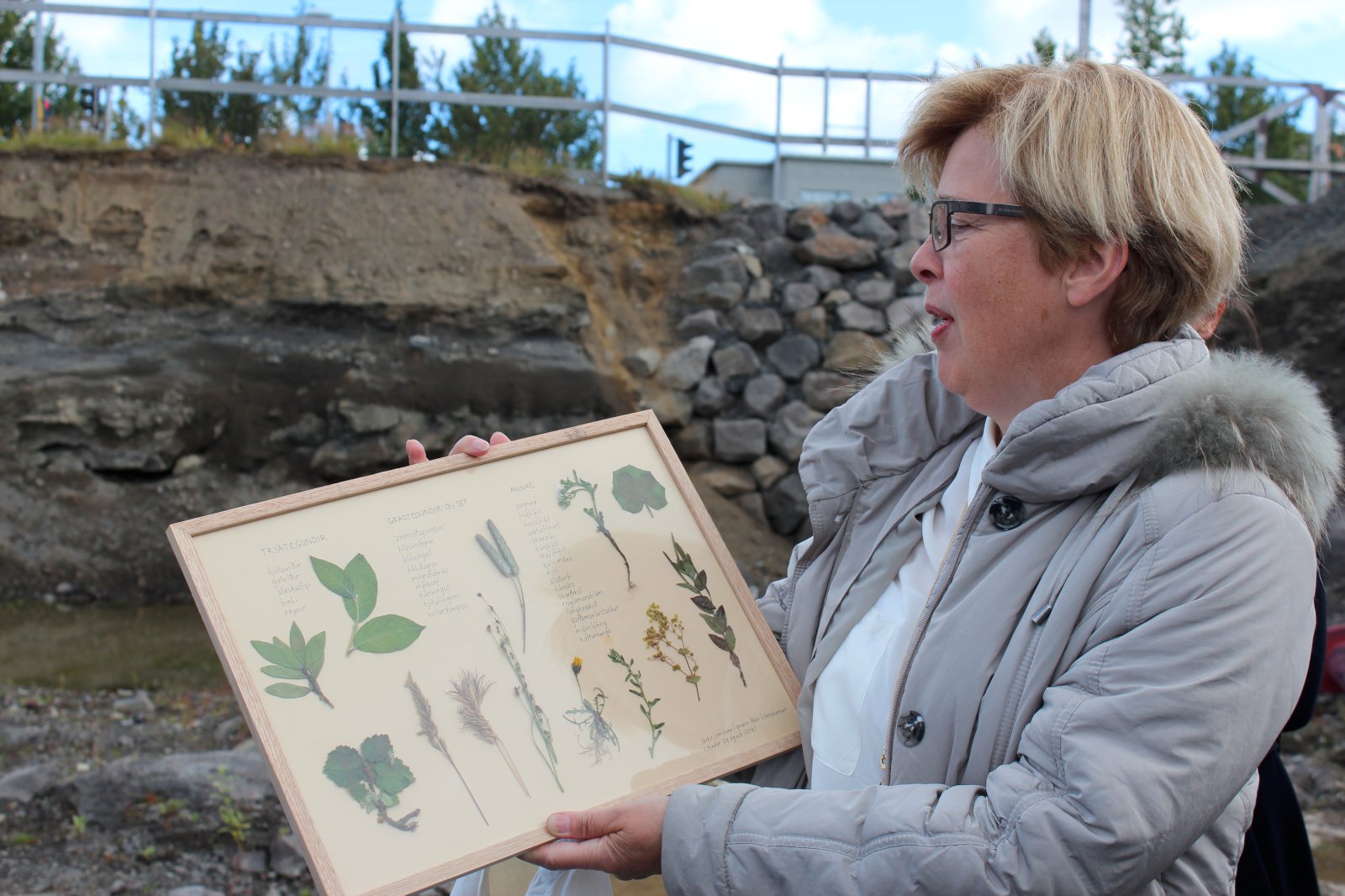 Eva María Jónsdóttir, kynningarstjóri Árnastofnunar, við plöntusöfnun í Holu íslenskrar tungu.