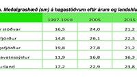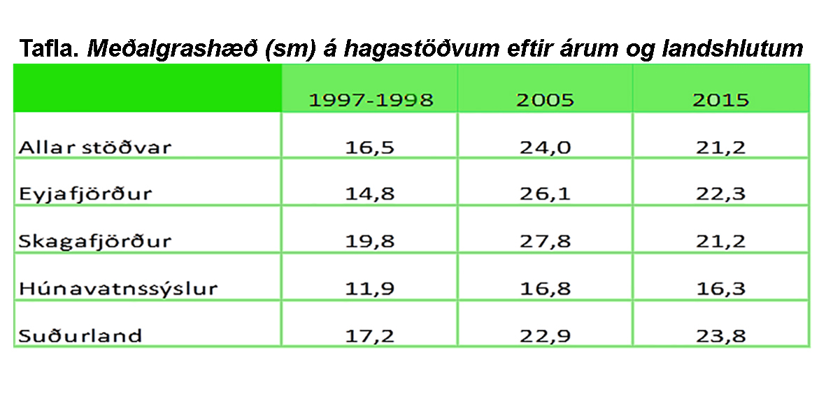 Þegar litið er til landshluta kom fram að í Eyjafirði og Skagafirði höfðu að meðaltali orðið minnstar breytingar á ástandi og grósku lands frá 2005 til 2015 og þar voru flest dæmi um að ástand hefði versnað milli úttekta. Í Húnavatnssýslum og á Suðurlandi komu hins vegar í ljós meiri breytingar milli úttekta og flestar í jákvæða átt. Vísbendingar um þetta má sjá í meðfylgjandi töflu er sýnir niðurstöður mælinga á grashæð (blaðhæð grasa og stara) eftir árum og landshlutum.