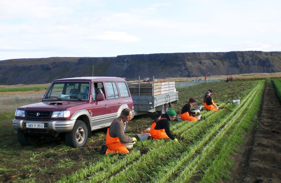 „Uppskeran í fyrra var með mesta móti og þá vorum við með fimmtán manns við uppskeru hjá okkur, en það verður eitthvað færra núna. Venjulega tökum við upp á bilinu 120–150 tonn og það er tekið upp með höndum, þó það væri nú hægt að notast við vélbúnað. Það er bara okkar sérviska og engin krafa um það í lífrænt vottaðri ræktun,“ segir Sigurbjörg. „Gulræturnar þola dálítið frost en þegar frostið er orðið nokkuð viðvarandi er hætta á að þær verði fljótt leiðinlegar. Þær springa þá í toppinn og kemst raki inn í þær. Þá geymast þær illa. Við höfum yfirleitt verið að taka upp í um mánuð, en líklega verður uppskerutímabilið styttra að þessu sinni.“