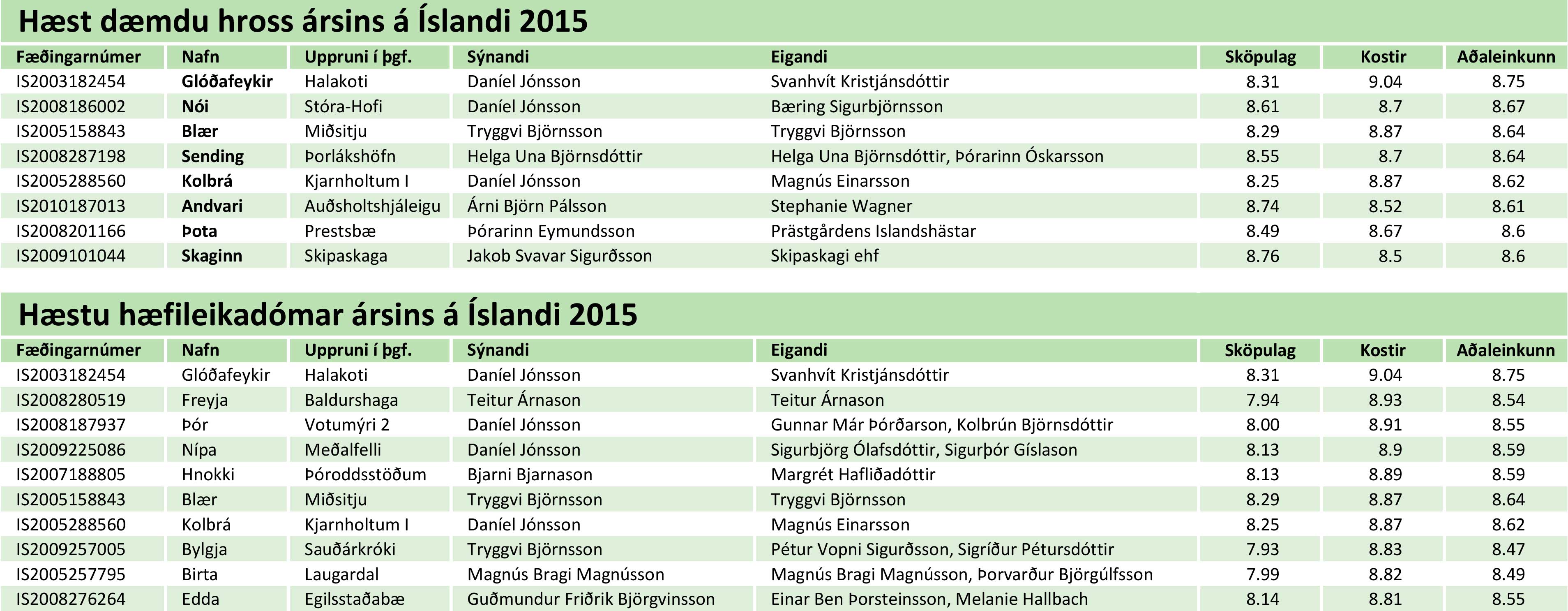 Alls voru 1.165 dómar kveðnir upp á kynbótasýningum á Íslandi í ár. Alls hlutu 475 aðaleinkunnina 8 eða hærra. Um 41% sýndra hrossa fengu því fyrstu verðlaun. Fram undan er uppskeruhátíð hrossaræktarinnar en hún fer jafnan fram í nóvember samhliða aðalfundi Félags hrossabænda. Þar verður farið yfir hrossaræktarárið 2015 og ræktendur verða heiðraðir fyrir árangur sinn í hrossarækt, þar sem afkvæmahross og afkastamikil hrossaræktarbú hljóta verðlaun.