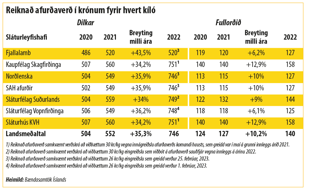 Landsmeðaltalshækkun á afurðaverði til sauðfjárbænda fyrir dilka hækkar um 35,3 prósent á milli ára, samkvæmt útreikningum Bændasamtaka Íslands, og er komið í 746 krónur á kílóið.