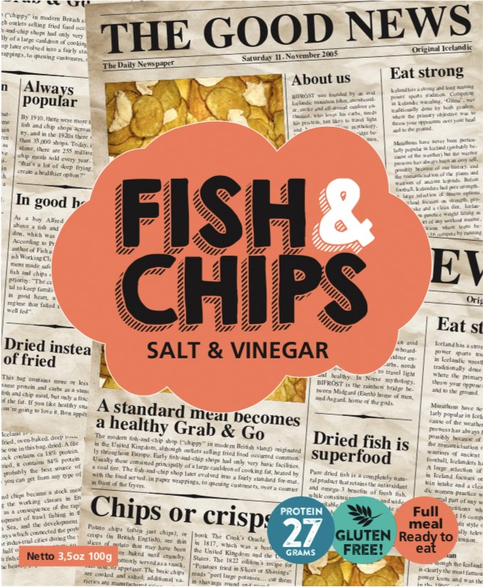 Til að byrja með verður boðið upp á tvær útgáfur af Fish and chips; annars vegar salti og pipar og hins vegar salti og ediki – sem er hin sígilda útgáfa bresku útgáfunnar. Meira verður af kartöfluflögunum í pokanum en harðfiskbitum, að sögn Rúnars, af tveimur ástæðum. „Hlutfallið af fisk á móti kartöflum ræðst annars vegar af hæfilegu próteininnihaldi máltíðar fyrir fullorðinn einstakling og svo hins vegar verðinu. Það þarf 160 grömm af fiskflökum til að framleiða þau 30 grömm af þurrkuðum fiski sem eru í hverjum poka, á móti 70 grömmum af kartöfluflögum. Það er álíka magn af fiski og er í venjulegum „fish and chips“ skammti í Bretlandi og víðar – og hæfilega mikið prótein í máltíð.