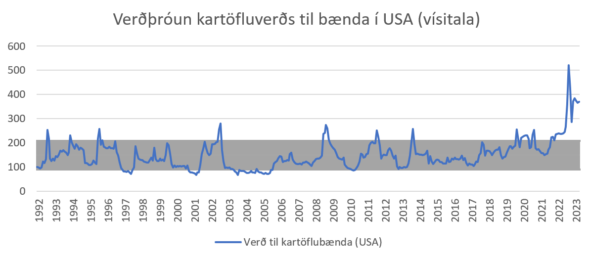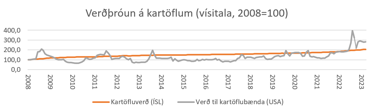 Þegar rýnt er í verðþróun á erlendum mörkuðum og borið saman við kartöfluverð á Íslandi sést að þrátt fyrir sveiflur á heimsmarkaðsverði er þróunin sambærileg þar til síðastliðið haust. Er verðið fyrir 100 kg af kartöflum núna tæpar 44 evrur, eða um 6.500 krónur. Það er enn töluvert lægra verð en gengur og gerist í íslenskum verslunum. Ódýrustu kartöflur í Krónunni eru á 296 kr/kg eða 29.600 fyrir 100 kg, en það er vissulega eftir pökkun, vinnslu og álagningu allra aðila í virðiskeðjunni og verðið því varla sambærilegt. Íslenskir bændur þurfa ólíklega að horfa upp á snöggar hækkanir á orkukostnaði og neytendur hafa ávallt geta treyst því að verð á kartöflum sveiflist ekki mikið enda mikilvægur hluti daglegrar fæðu flestra. Kartöfluverð á Íslandi hefur alla tíð haldist hönd í hönd við almennt verðlag en framleiðsla hefur dregist saman á undanförnum árum og er því spurning hvort að þörf sé á einhverjum breytingum í sölu- og markaðsaðgerðum til að ýta undir söluna.