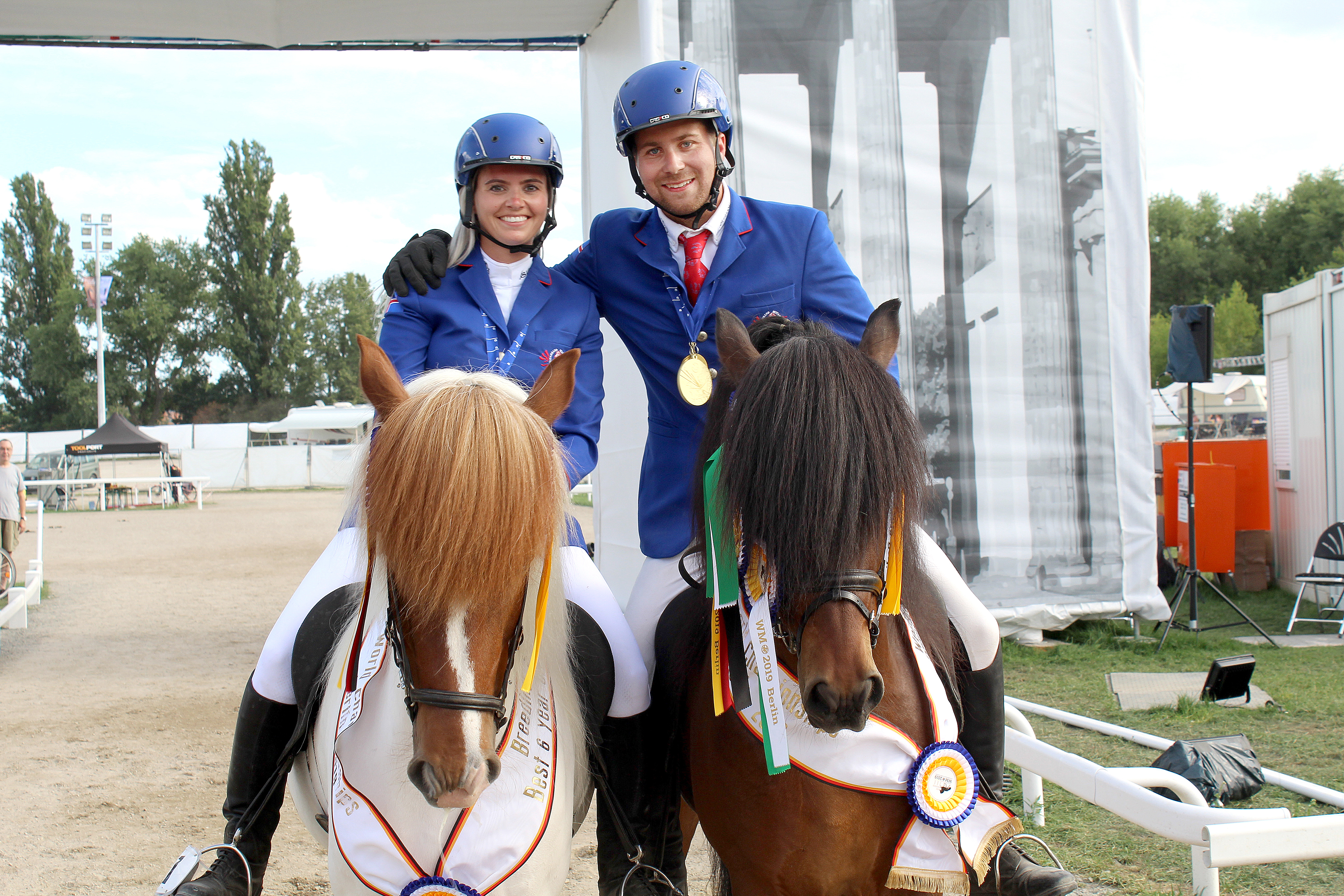 Parið og heimsmeistararnir, Eyrún Ýr Pálsdóttir og Teitur Árnason, eftir sigurinn á HM í Berlín í sumar. Teitur varð heimsmeistari á Dynfara frá Steinnesi í gæðingaskeiði og Eyrún Ýr varð heimsmeistari á nöfnu sinni frá Hásæti í flokki sex vetra hryssna.