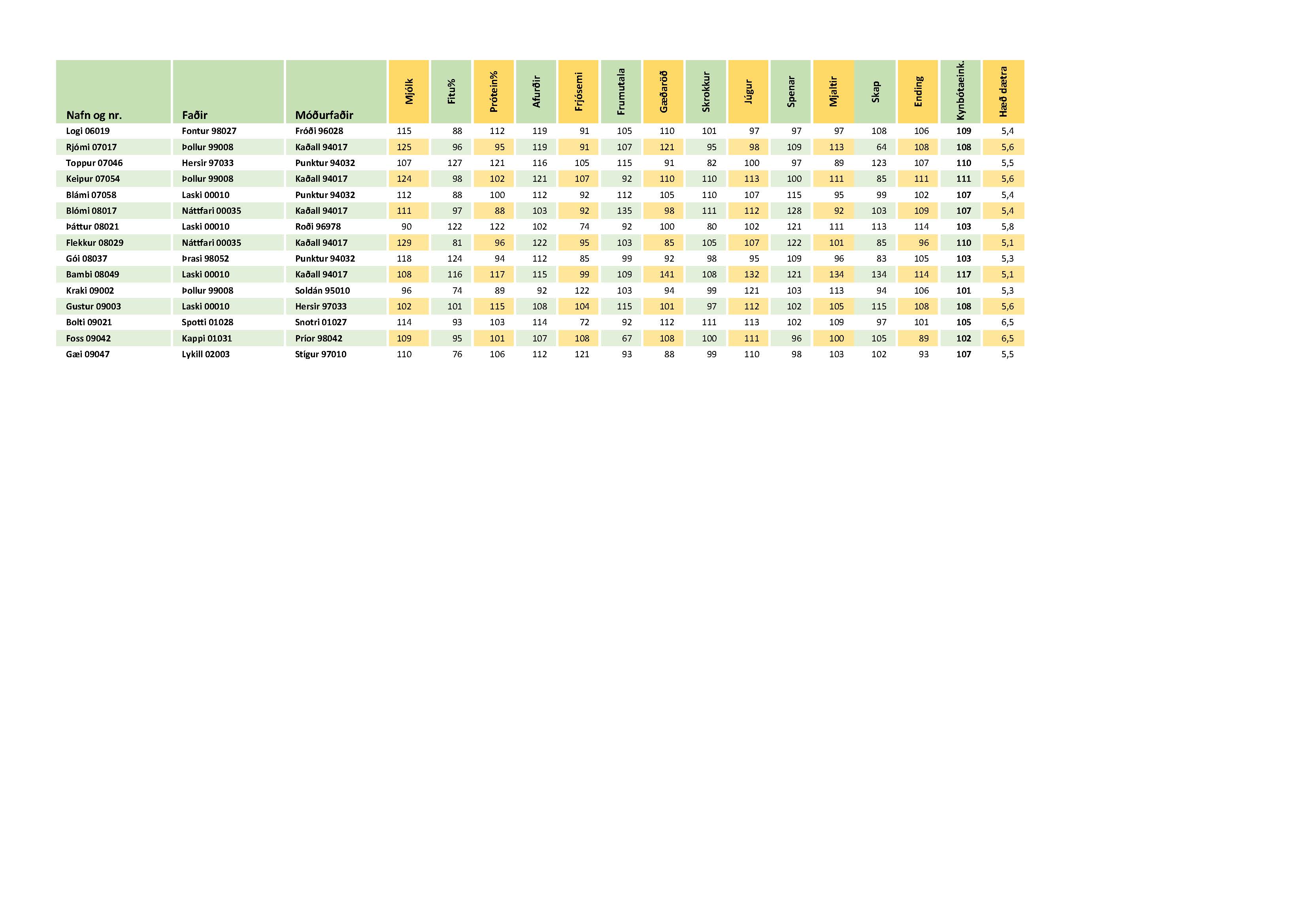 Rétt er að taka fram að við þessa keyrslu var svokallaður viðmiðunarárgangur færður fram um fimm ár, þ.e. sá árgangur sem meðaltal stofnsins er miðað við. Þetta þýðir að kynbótamatið lækkar nokkuð án þess að breyting hafi orðið á raunverulegu kynbótagildi gripanna. Framvegis mun þetta verða gert á hverju ári þannig að breytingar á kynbótamatinu verði minni og jafnharðan hverju sinni.