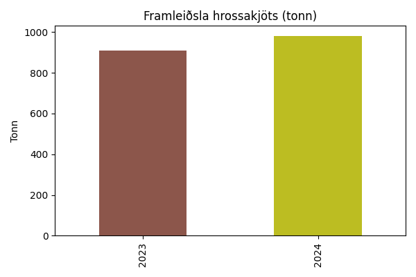 Íslensk framleiðsla á hrossakjöti er tiltölulega lítil miðað við aðrar kjöttegundir og nam 910 tonnum árið 2023 og 982 tonnum árið 2024, samkvæmt upplýsingum Matís á Kjötbókinni. Hrossakjöt er þar með aðeins um 3,4% af heildarkjötframleiðslu landsins, sem undirstrikar hversu takmörkuð auðlind það er í íslenskum landbúnaði.