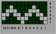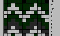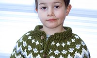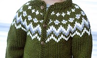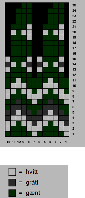 Ermar: Fitjið upp á sokkaprjóna nr 7, 20-24 26 lykkjur með mosagrænu, prjónið perluprjón í hring 6 umferðir. Prjónið nú 1 umferð slétt og aukið út um 4-6-4 lykkjur þá eiga að vera 24-30-30 lykkjur á prjónunum. Prjónið nú mynstur 1 og  í annarri umf eftir mynstur er aukið út á miðri undirermi um 2 lykkjur.