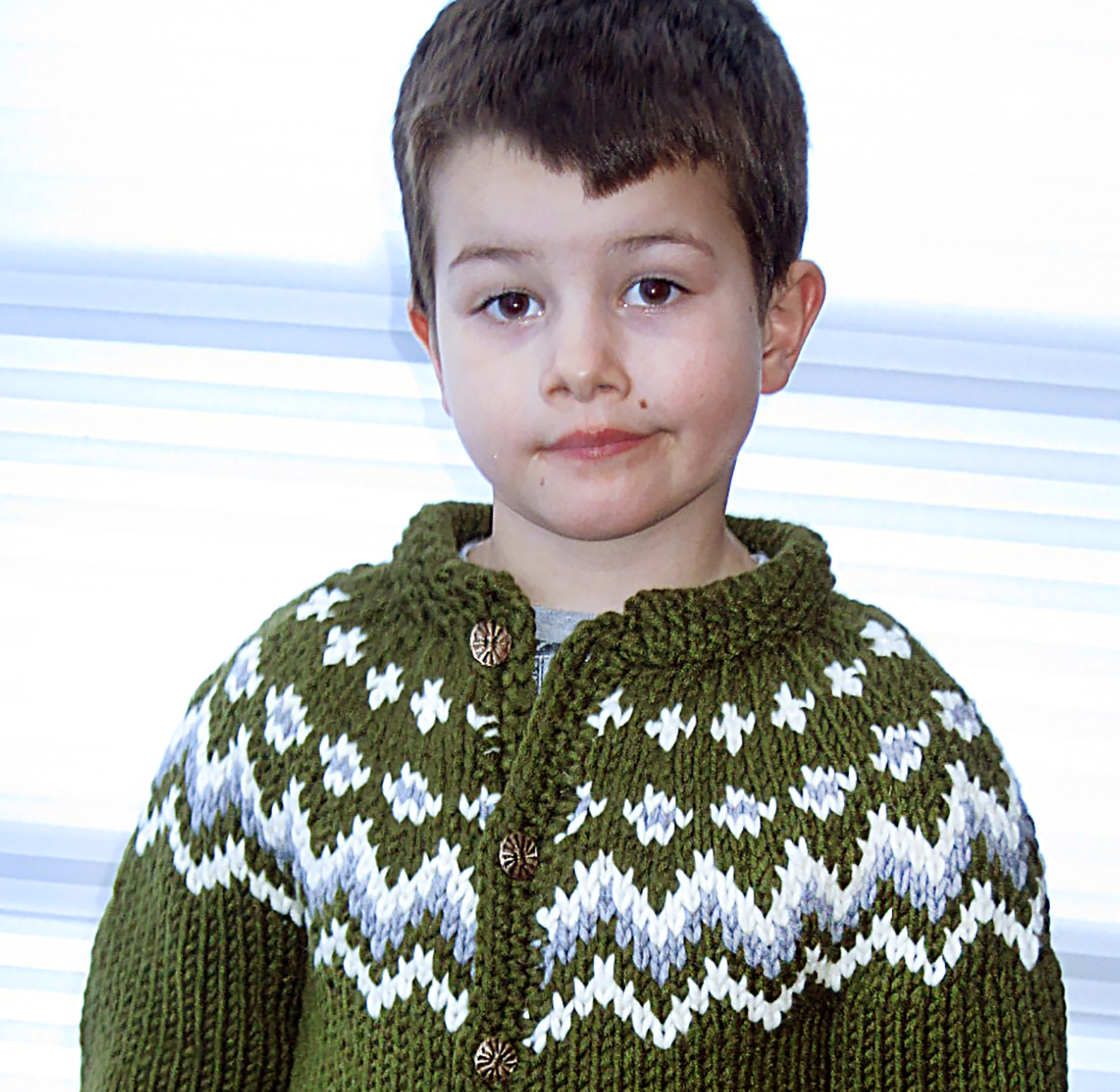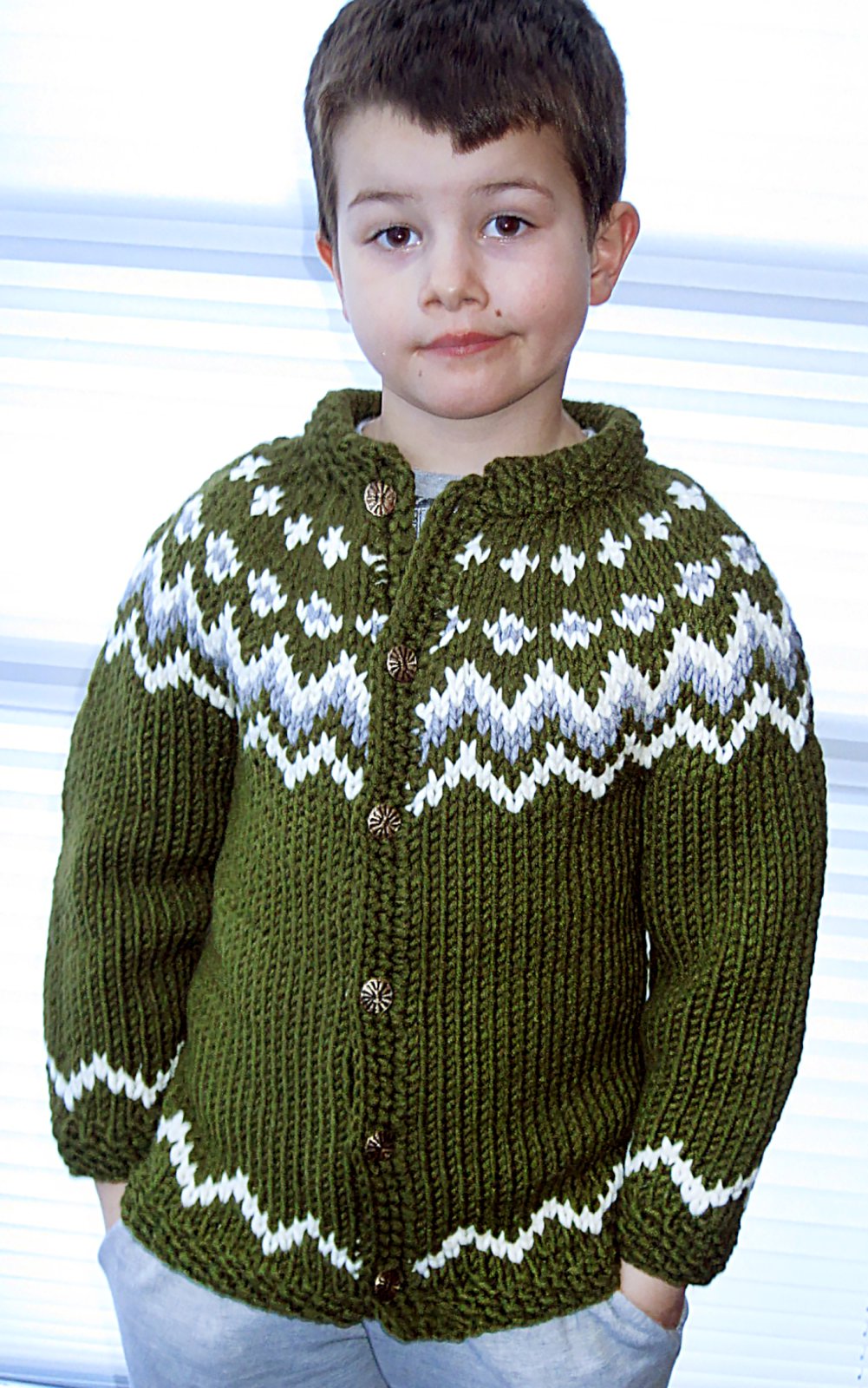 Fitjið upp 65-71 -78 lykkjur á hringprjón nr 7 með mosagrænum og prjónið perluprjón 6 umferðir fram og til baka. Tengið nú í hring og og bætið við 1 lykkju við samskeytin og sú lykkja er prjónuð brugðin upp alla flíkina en telst ekki með í lykkjufjölda, er notuð til að sauma í þegar peysan er klippt í sundur. Prjónið nú 1 umferð slétt í hring og aukið út um 7-7-6 lykkjur þá eiga að vera 72-78-84 lykkjur á prjóninum. Prjónið nú mynstur nr 1. Í fyrstu umferð eftir mynstur þarf að auka út um 1 lykkju í hvorri hlið fyrir stærð 4-5 og 6-7 til að lykkjufjöldinn passi fyrir mynstrið í axlarstykkinu. Þannig verða 72-80-86 lykkjur á prjóninum.